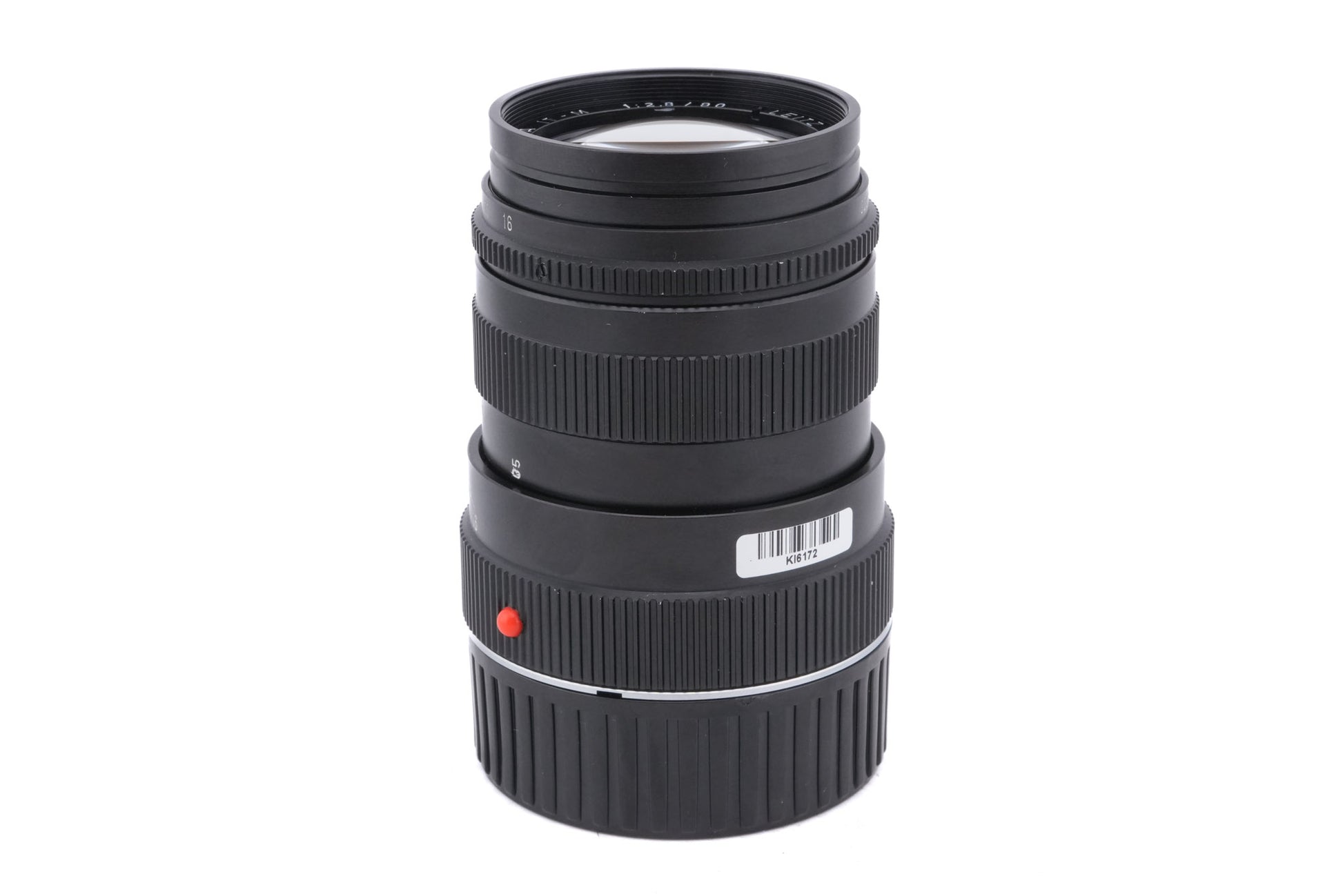 Manual focus telephoto lens made for M-mount rangefinder cameras introduced by Leica in 1973. This is an improved version of the earlier 90mm f2.8 Tele-Elmarit from 1964. The optical formula changed from a 5 to a 4-element design. The overall design of the lens had also changed, now with a slimmer profile and a fine knurled focusing ring. The lens was introduced at the same time as the 135mm focal length was discontinued, and was therefore developed with a 1.5x extender in mind to provide a compact 135mm lens. It is sometimes referred to as the "Thin" Tele-Elmarit. NOTE: It uses the same code as the earlier version. Metal body available in black (11800).