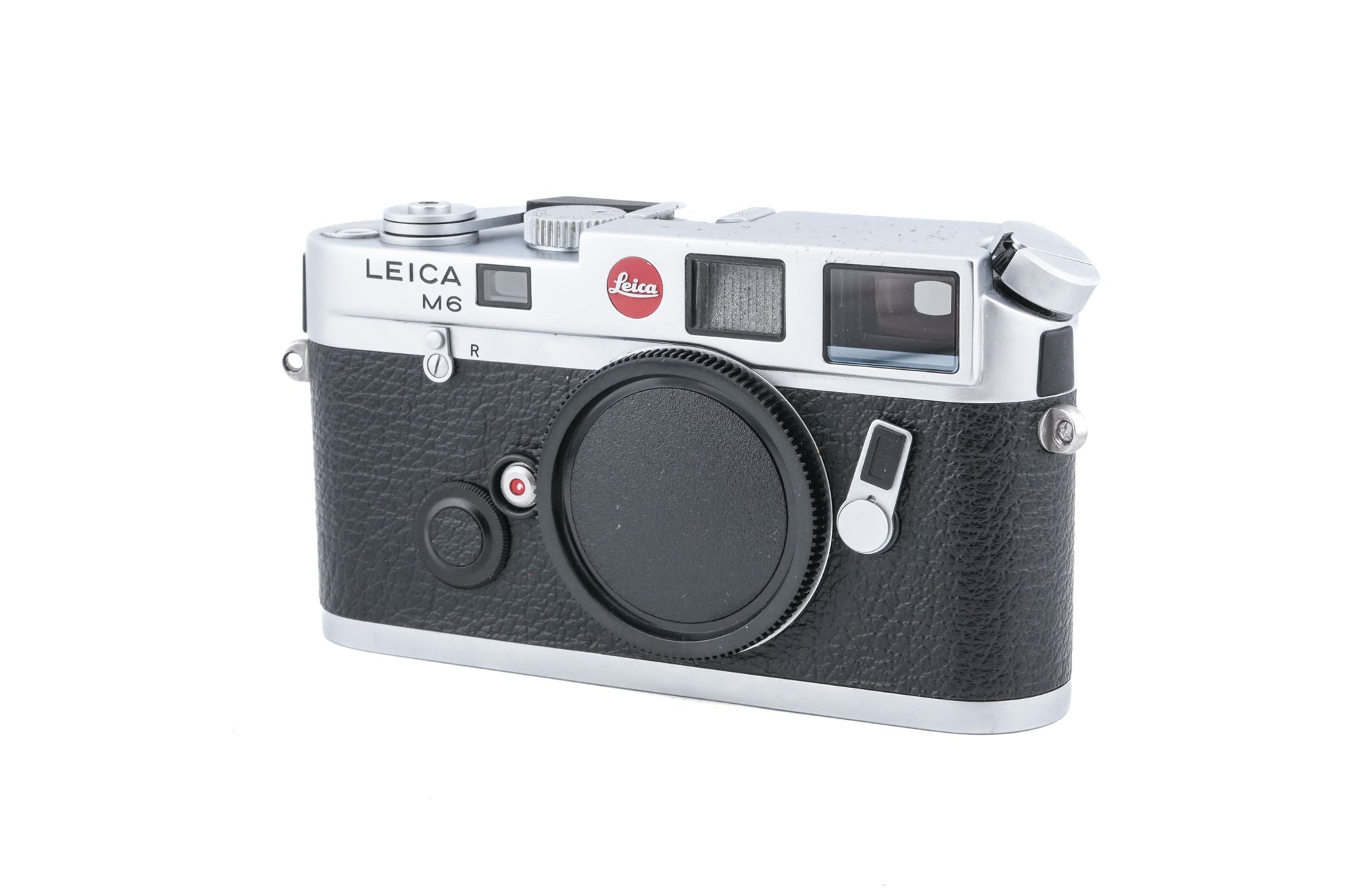 Manual focus M-mount 35mm rangefinder camera introduced by Leica in 1984. The M6 is similar to the M4-P but adds through-the-lens metering. The top cover was changed to a zinc casting making the M6 stronger than the previous M series cameras. Like the M4-P the M6 has a 0.72x viewfinder with framelines for 28/90mm, 35/135mm, and 50/75mm. This silver version was briefly available with black controls commonly known as the “M6 Panda” but was by 1992 changed back to fully silver chrome. Metal body available in silver (10414).