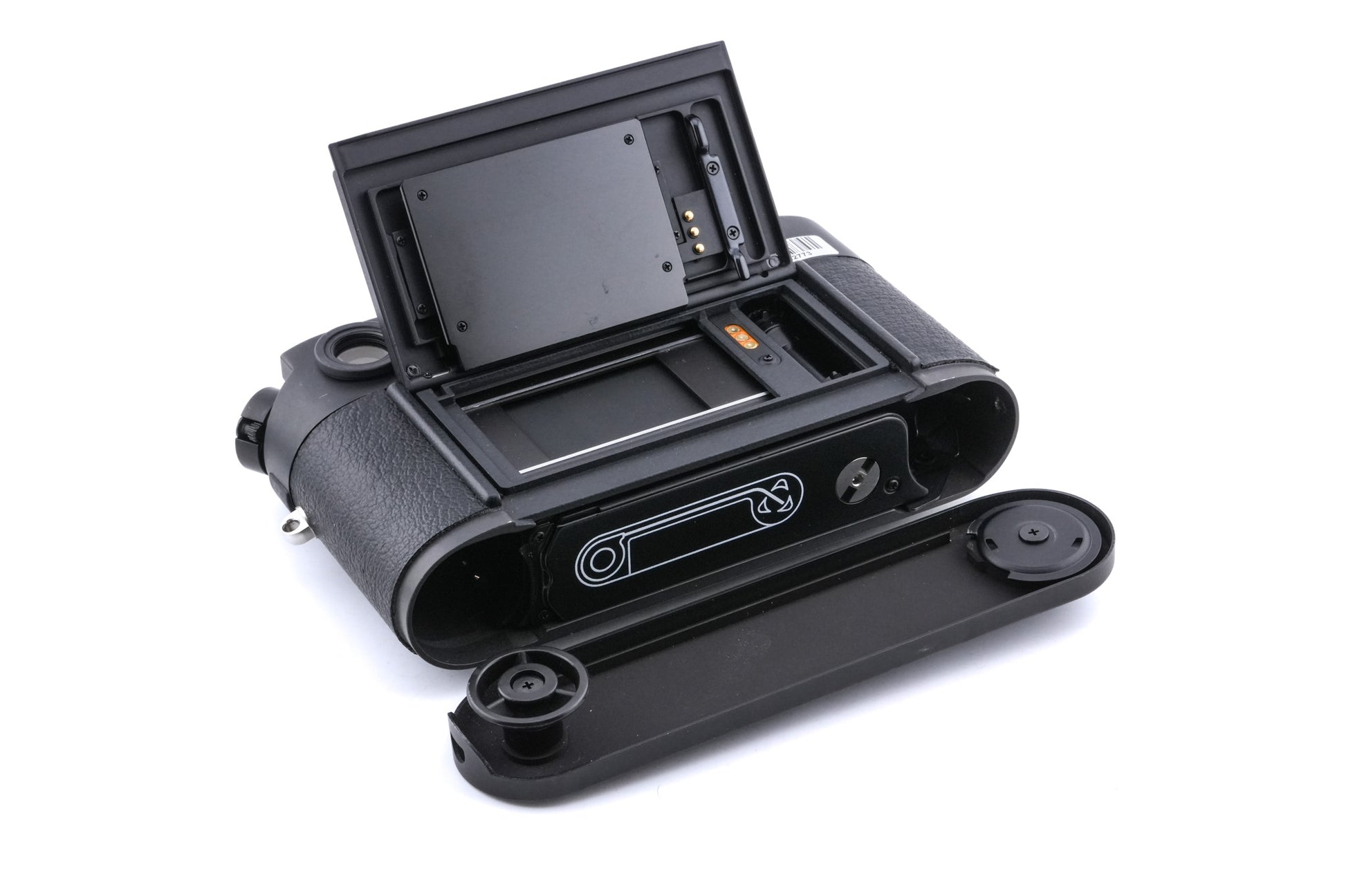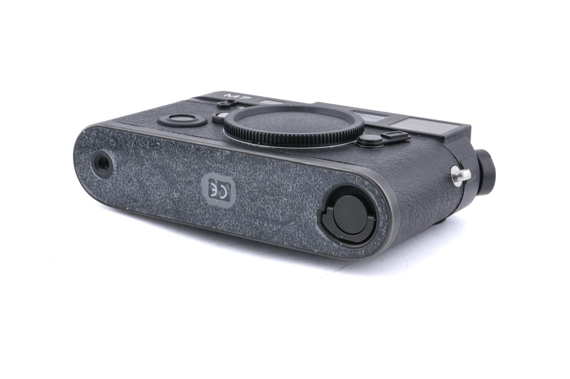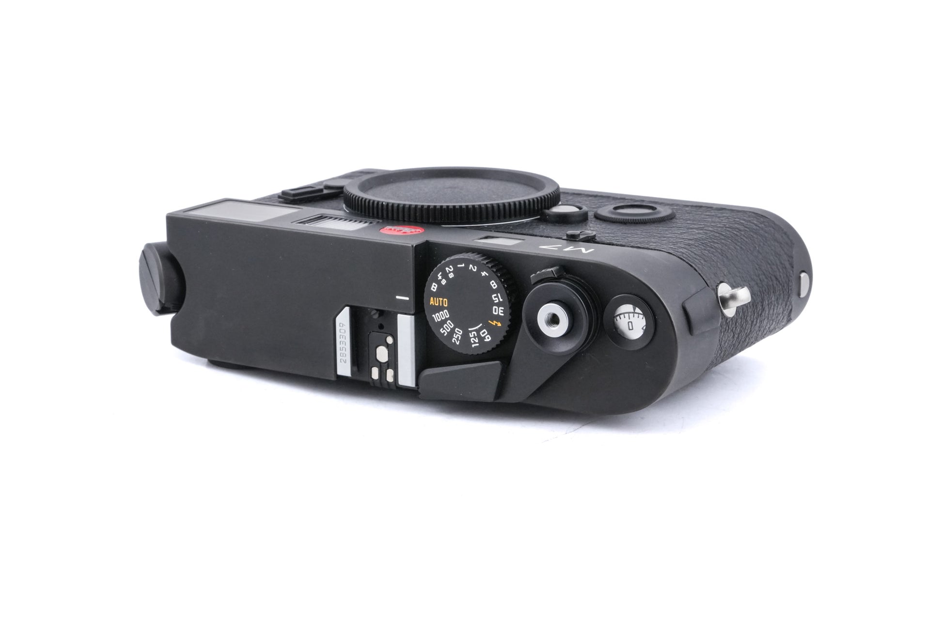 Manual focus M-mount 35mm rangefinder camera introduced by Leica in 2002. The M7 is similar to the M6 in appearance, but it added an electronic shutter control with automatic aperture priority. It has a circuit breaker switch around the shutter release button that also acts as a safety catch for the button itself. It was available in three configurations: a 0.72x viewfinder (framelines for 28/90mm, 35/135mm, and 50/75mm), a 0.58x viewfinder (framelines for 28/90mm, 35mm, and 50/75mm), and a 0.85x viewfinder (framelines for 35/135mm, 50/75mm, and 90mm). The 0.72x was available in black and silver, while the 0.58x and 0.85x were available in black only. The camera uses two CR1/3N lithium batteries. Metal body available in black (10505).