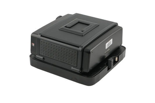 Film back made for RZ67 120 SLRs by Mamiya. This is the second version that added a film memo and dark slide holder. It connects to the body electronically to communicate ISO information. Plastic & metal body available in black.