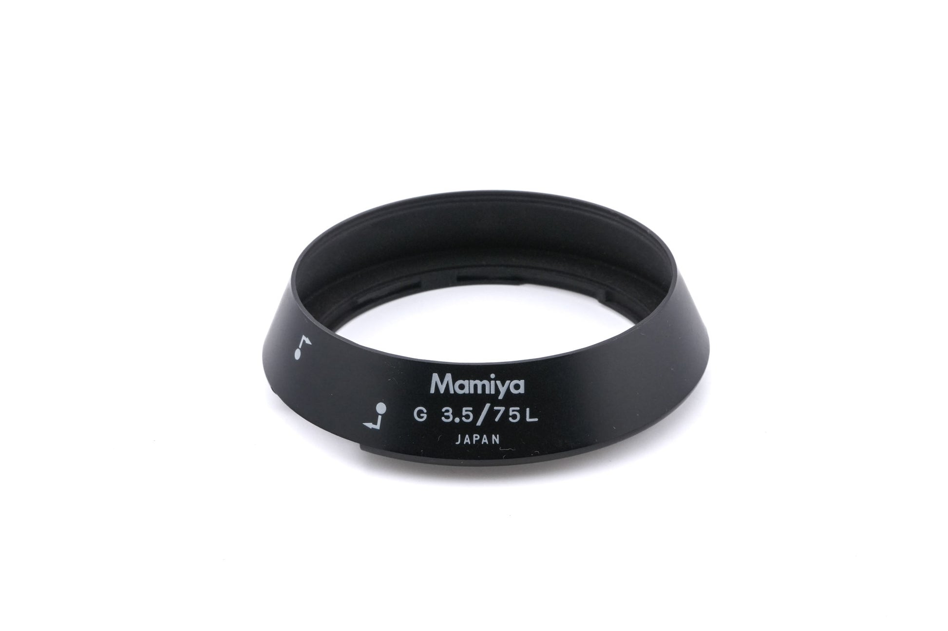 Lens hood made for 6 mount 120 SLRs by Mamiya. It attaches to the 75mm f3.5 G L lens with a proprietary bayonet. It has a small cutout to improve visibility when mounted. Plastic body available in black.