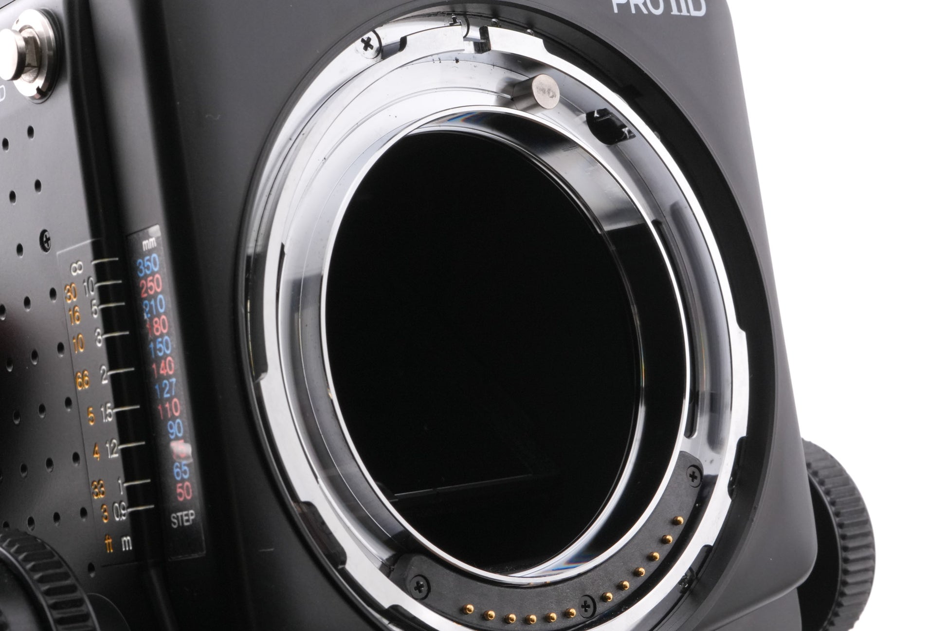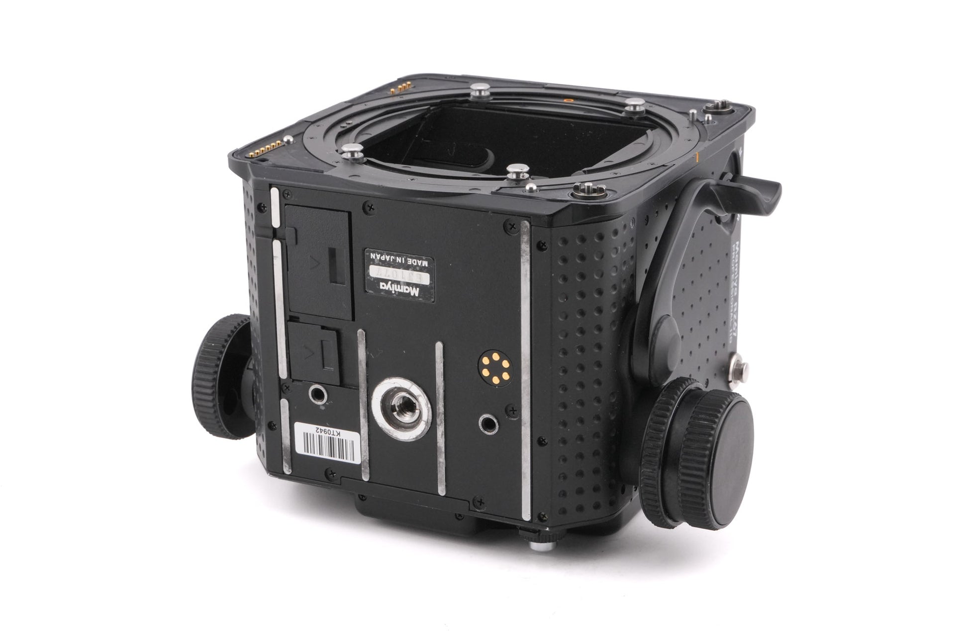 Manual focus 6x6 medium format camera made by Mamiya in 2004. It features pins for the digital backs, auto exposure mode, and a fine focusing knob. Plastic / Metal body available in black.