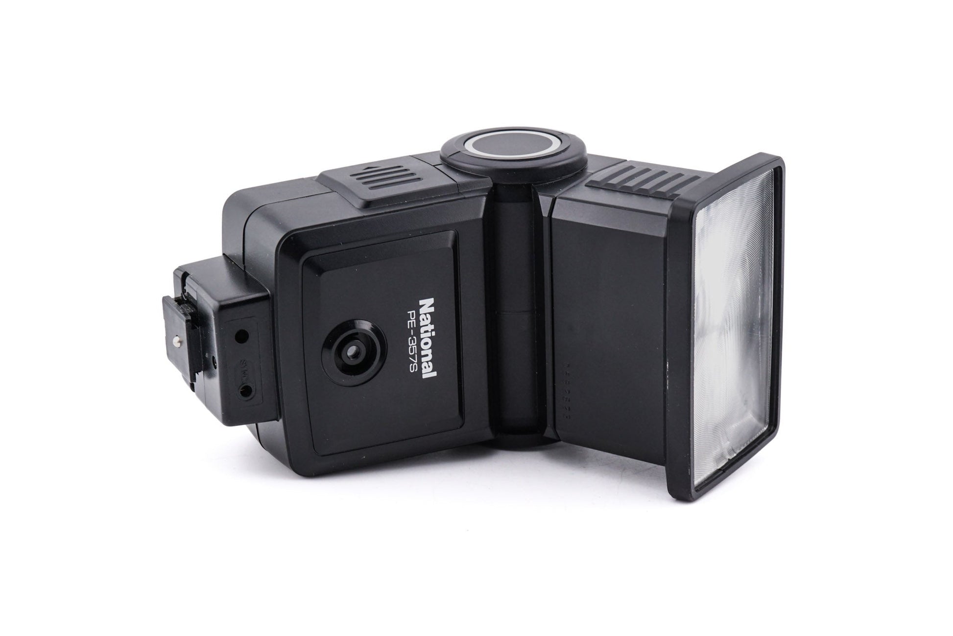 Flash made by National for all manual flash cameras. Has adjustable strength, zoom, and angle. Has a single contact point on the base. Black plastic body.