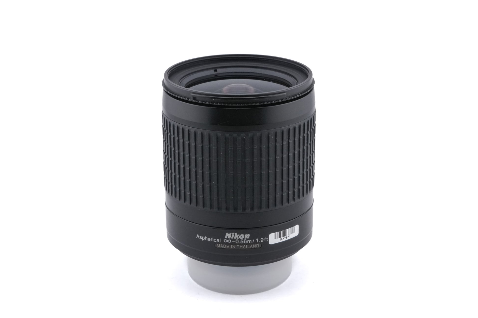 Autofocus wide-short telephoto zoom lens made for F-mount (D)SLR cameras by Nikon. Plastic body in black and silver.