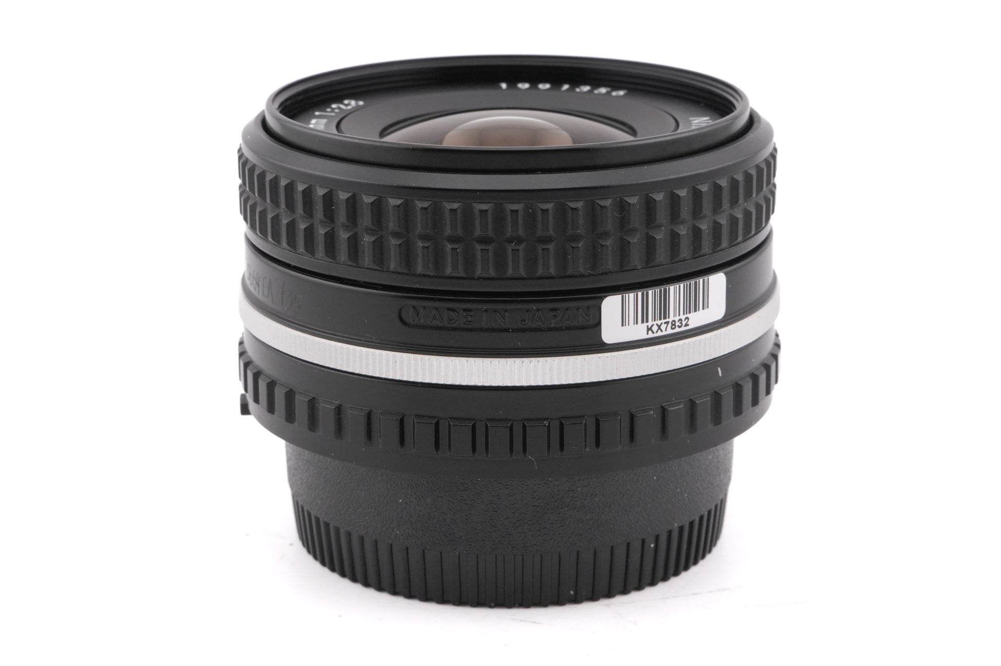 Manual focus wide-angle lens made for F-mount 35mm SLR cameras introduced by Nikon starting in 1979. It has the AI ridge and AI-S indent, which means it will meter properly on most manual Nikon cameras (excluding the F, F2, and Nikkormats) and can be used with the advanced program modes of later cameras. Older models are all black and newer ones have a silver ring above the aperture ring. Plastic body available in black.