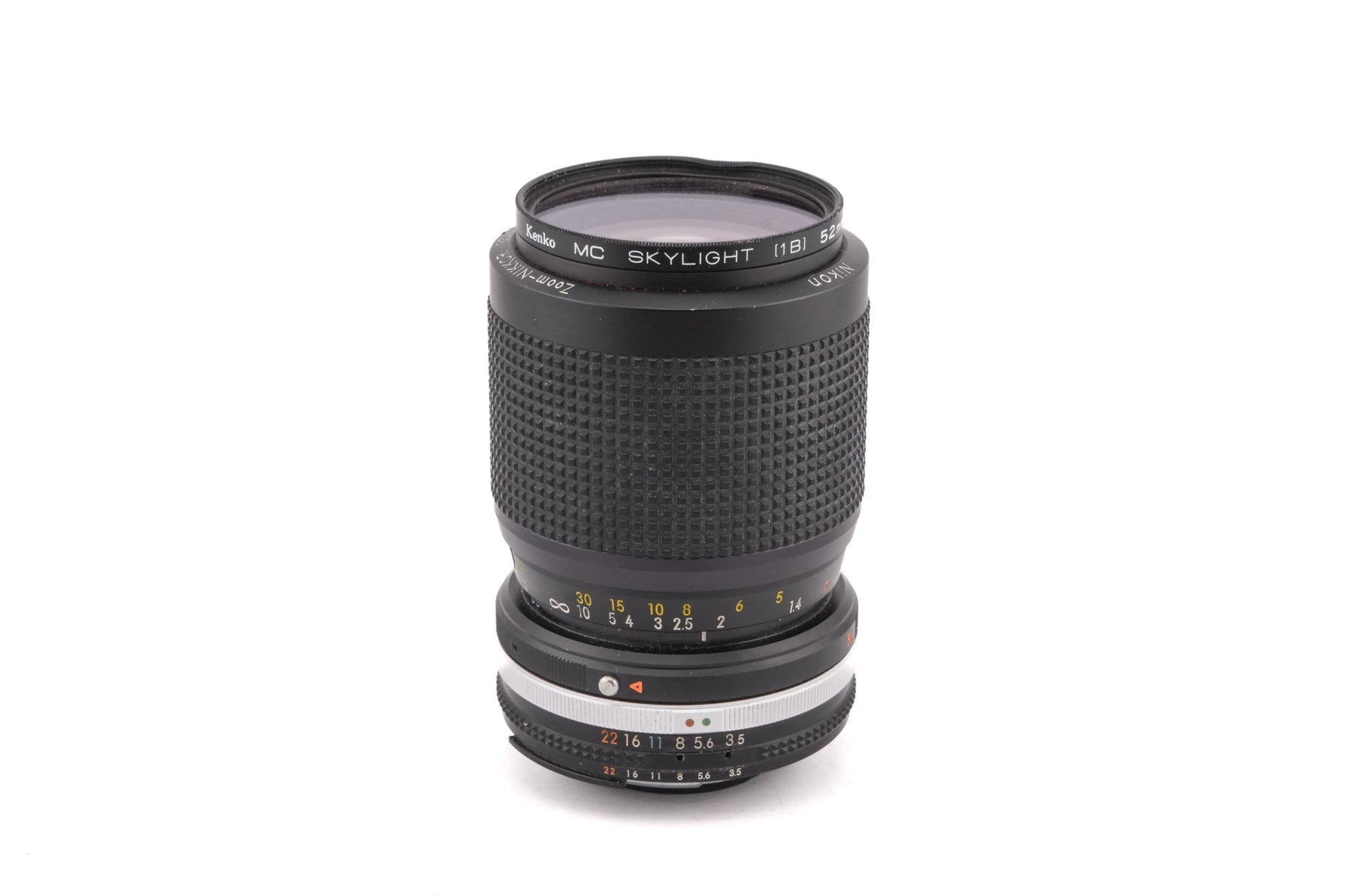 Manual focus zoom lens made for F-mount 35mm SLR cameras introduced by Nikon. It uses a one-touch, push/pull zoom mechanism. It has the AI ridge, AI-S indent, and bunny ear metering prongs, so it will meter on all manual Nikon bodies and can be used with the advanced program modes of later cameras. Metal body available in black.
