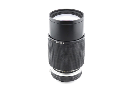Manual focus push/pull telephoto zoom lens made for Nikon F mount SLR cameras by Nikon introduced in 1982. Metal body available in black.