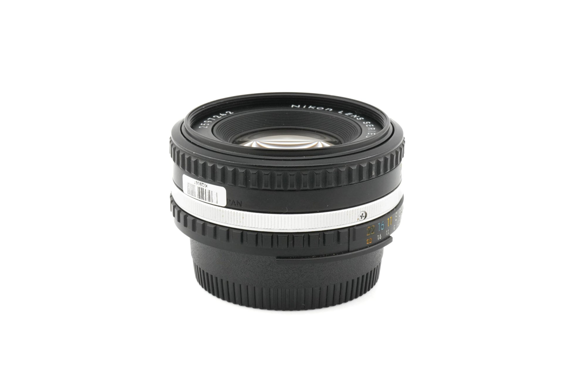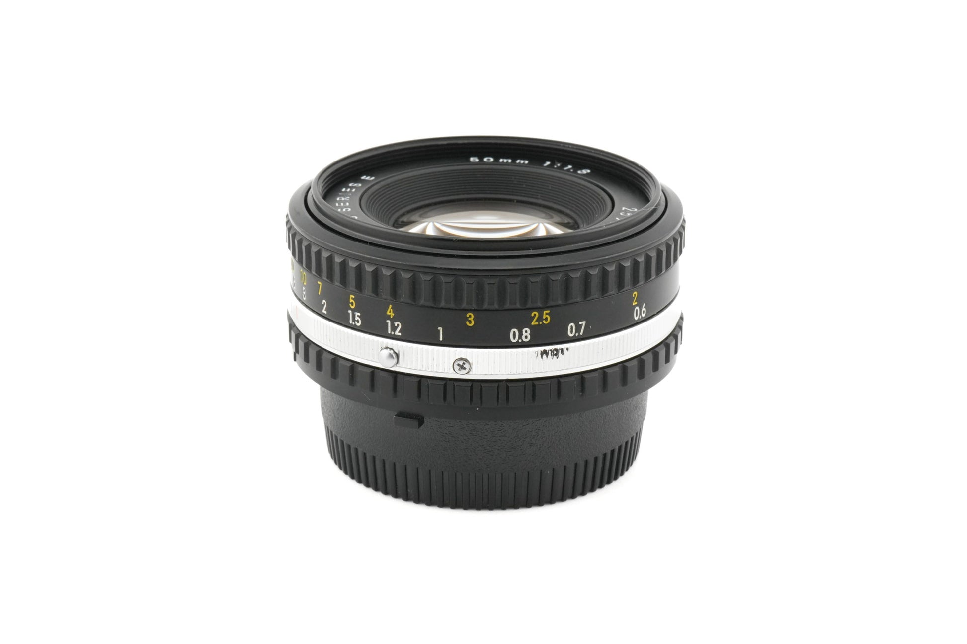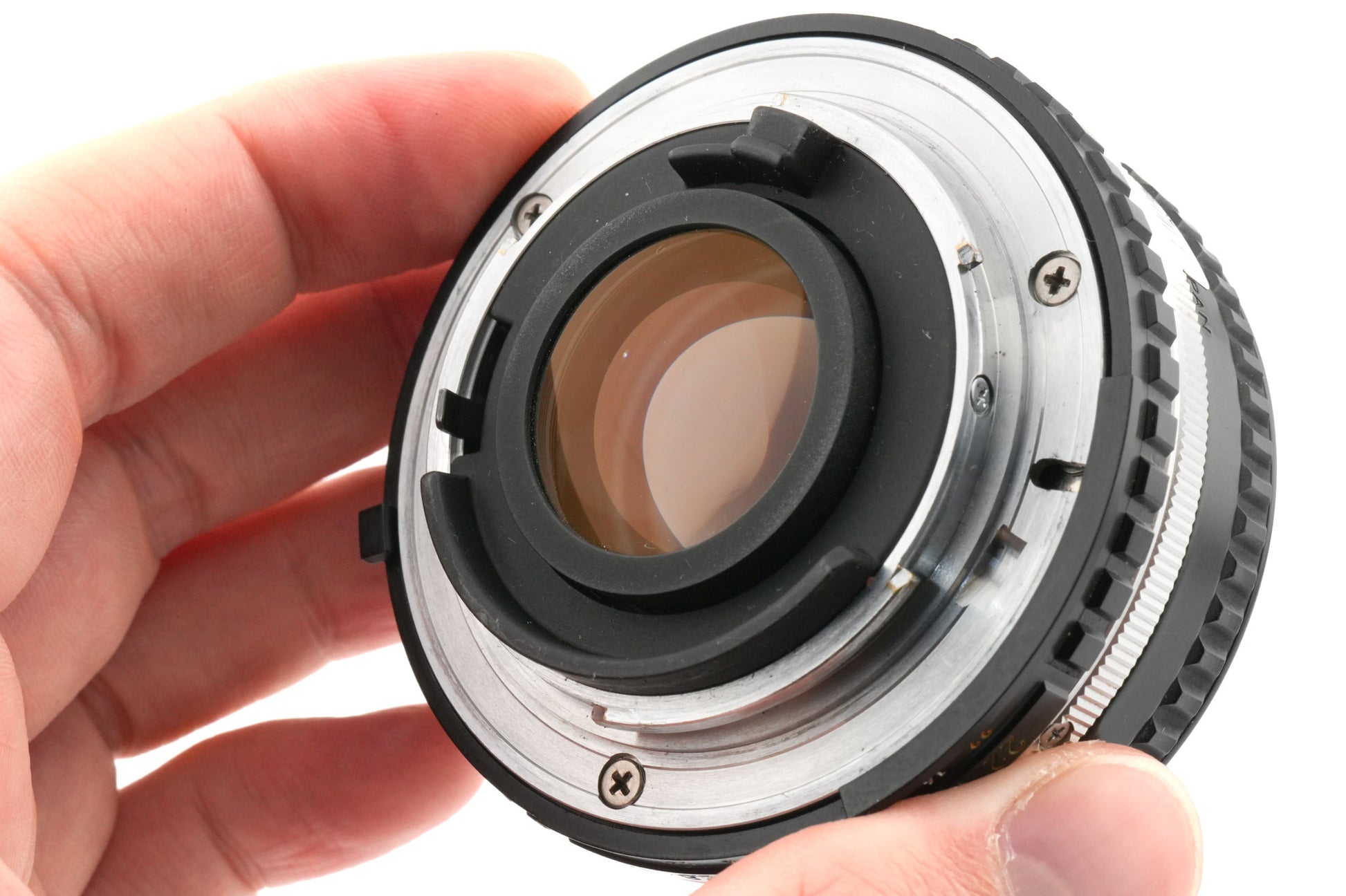 Manual focus normal lens made for F-mount 35mm SLRs by Nikon. It does not have the bunny ear metering prongs but does have the AI ridge and AI-S indent, so it will meter properly on nearly all manual focus Nikon cameras (excluding F, F2, and Nikkormat) and will work with the advanced program modes of later models. Early versions are all black, and later versions have a chrome ring. Metal and plastic body available in black.