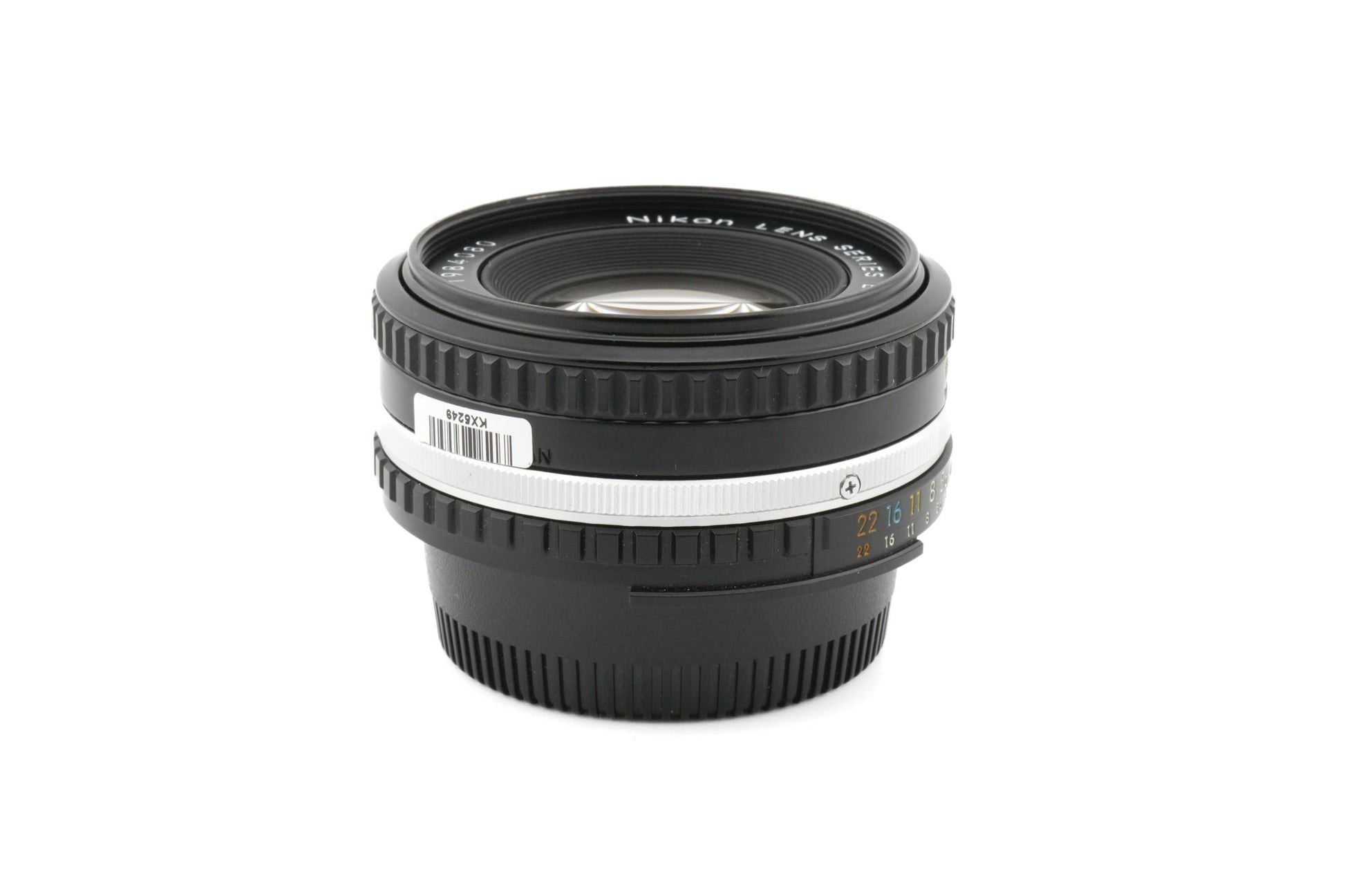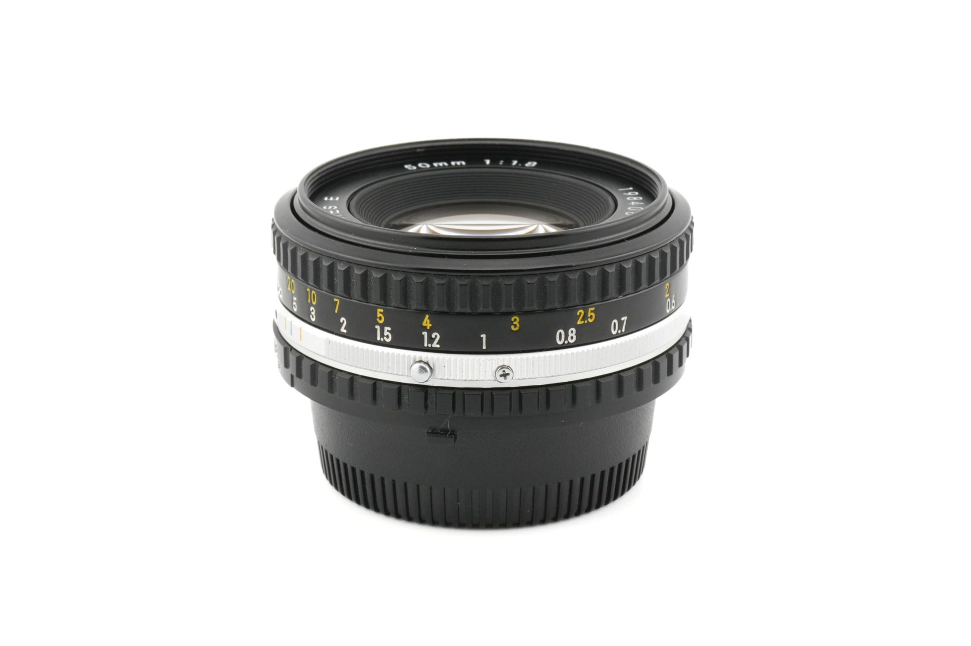 Manual focus normal lens made for F-mount 35mm SLRs by Nikon. It does not have the bunny ear metering prongs but does have the AI ridge and AI-S indent, so it will meter properly on nearly all manual focus Nikon cameras (excluding F, F2, and Nikkormat) and will work with the advanced program modes of later models. Early versions are all black, and later versions have a chrome ring. Metal and plastic body available in black.