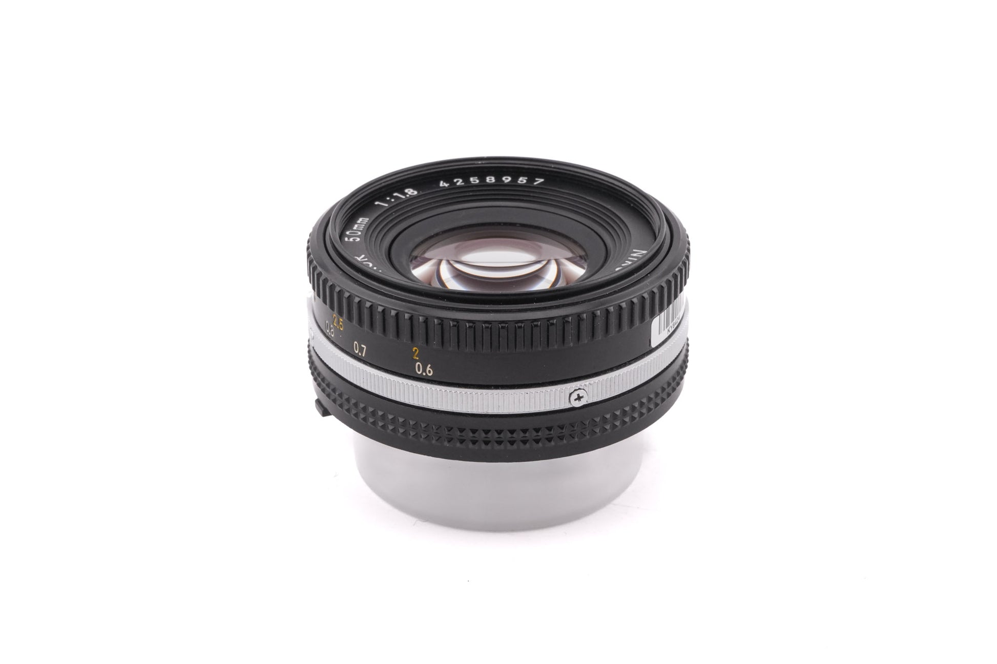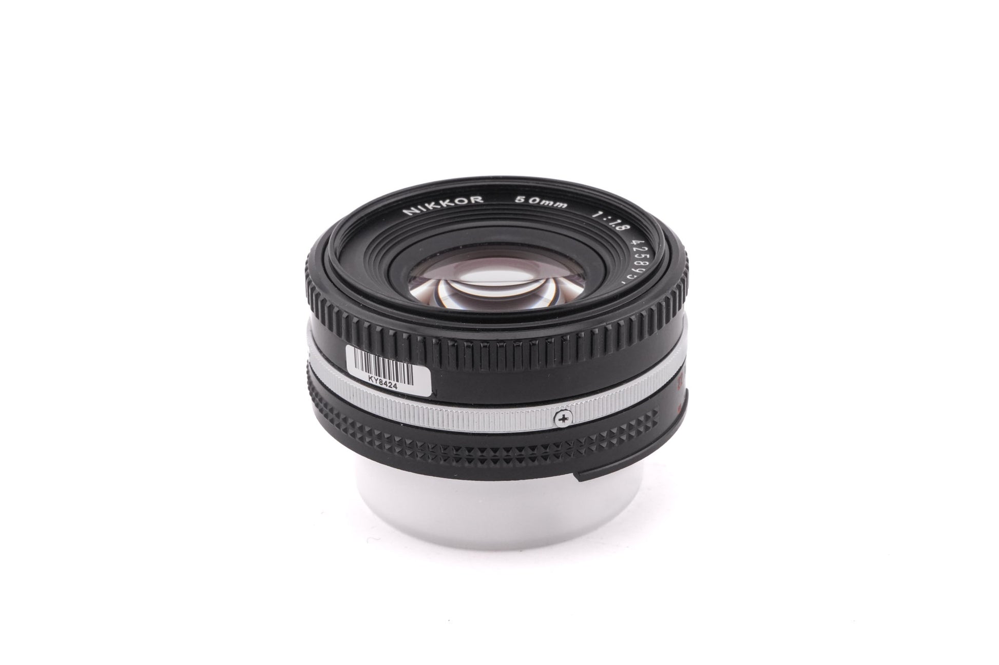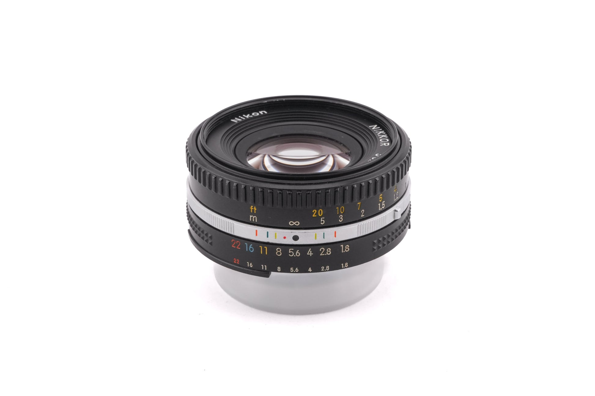 Manual focus normal lens made for F-mount 35mm SLRs by Nikon. It does not have the bunny ear metering prongs but does have the AI ridge and AI-S indent, so it will meter properly on nearly all manual focus Nikon cameras (excluding F, F2, and Nikkormat) and will work with the advanced program modes of later models. Early versions are all black, and later versions have a chrome ring. Metal and plastic body available in black.