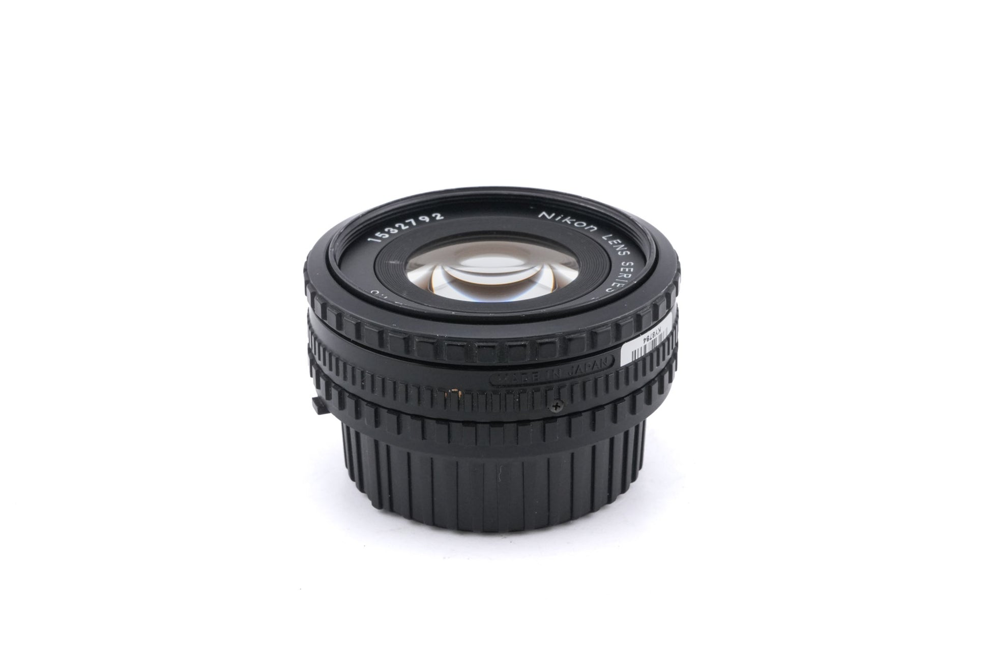 Manual focus normal lens made for F-mount 35mm SLRs by Nikon. It does not have the bunny ear metering prongs but does have the AI ridge and AI-S indent, so it will meter properly on nearly all manual focus Nikon cameras (excluding F, F2, and Nikkormat) and will work with the advanced program modes of later models. Early versions are all black, and later versions have a chrome ring. Metal and plastic body available in black.