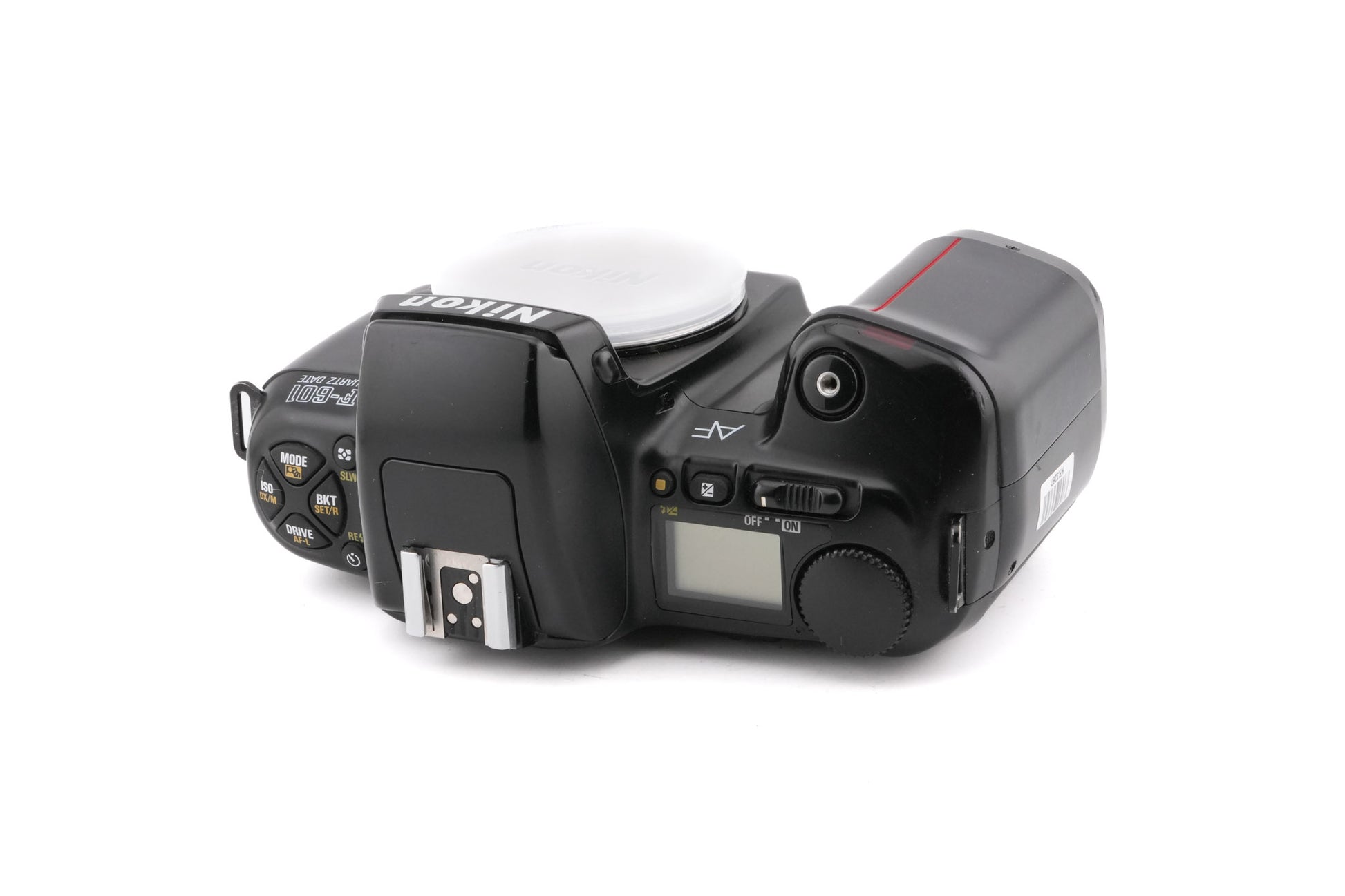 Autofocus F-mount 35mm SLR camera introduced by Nikon in 1990. Metal and plastic body available in black.