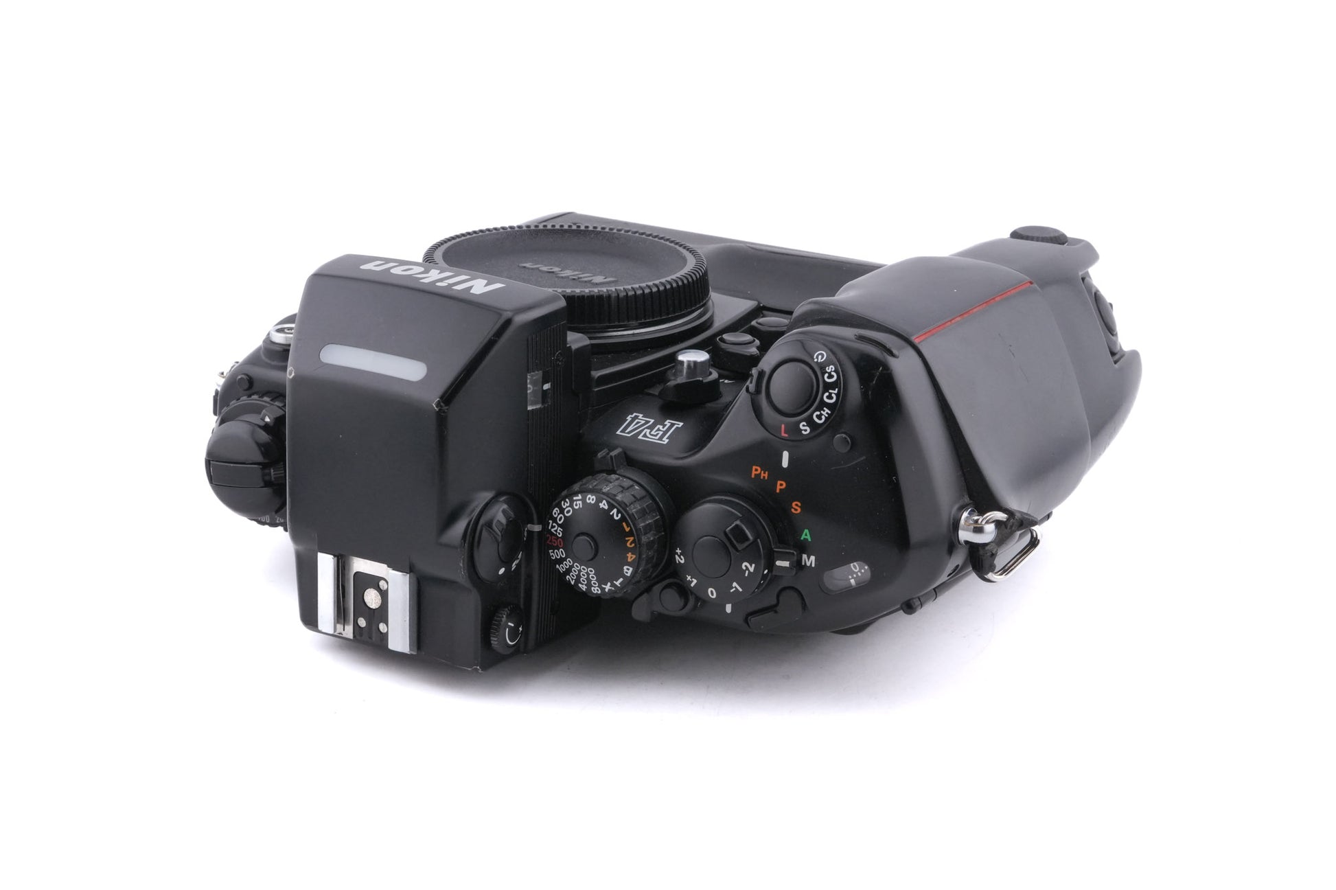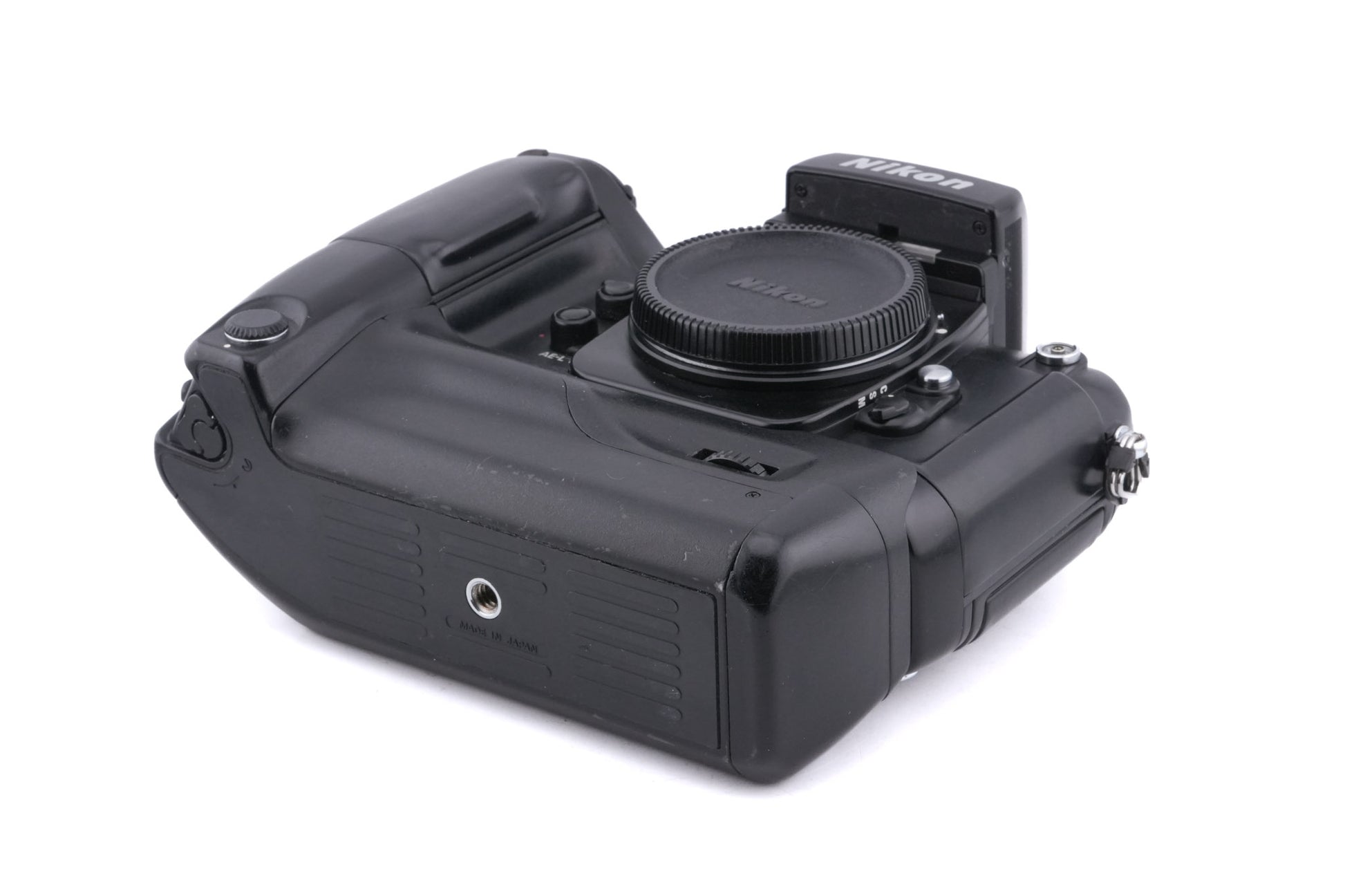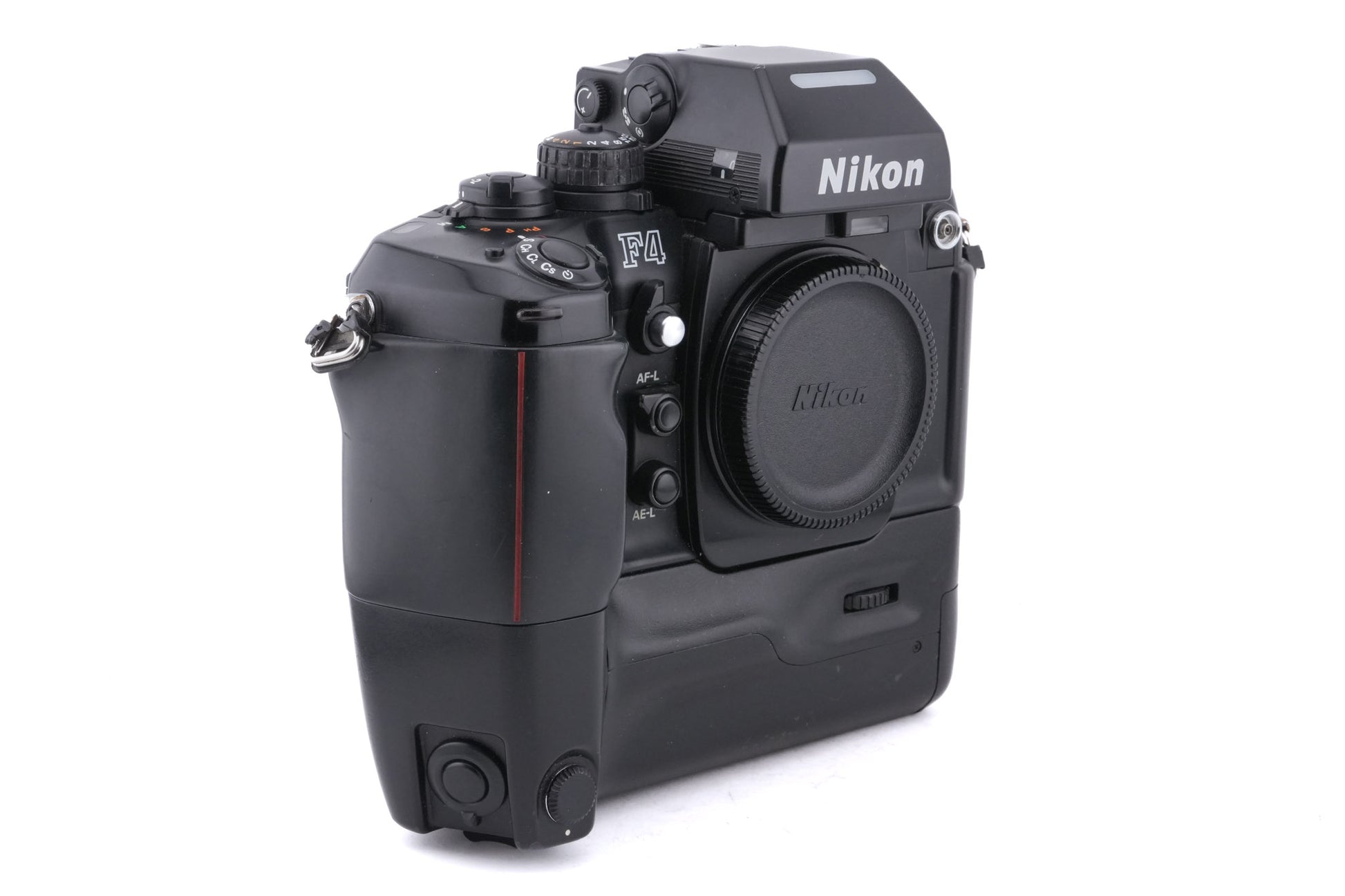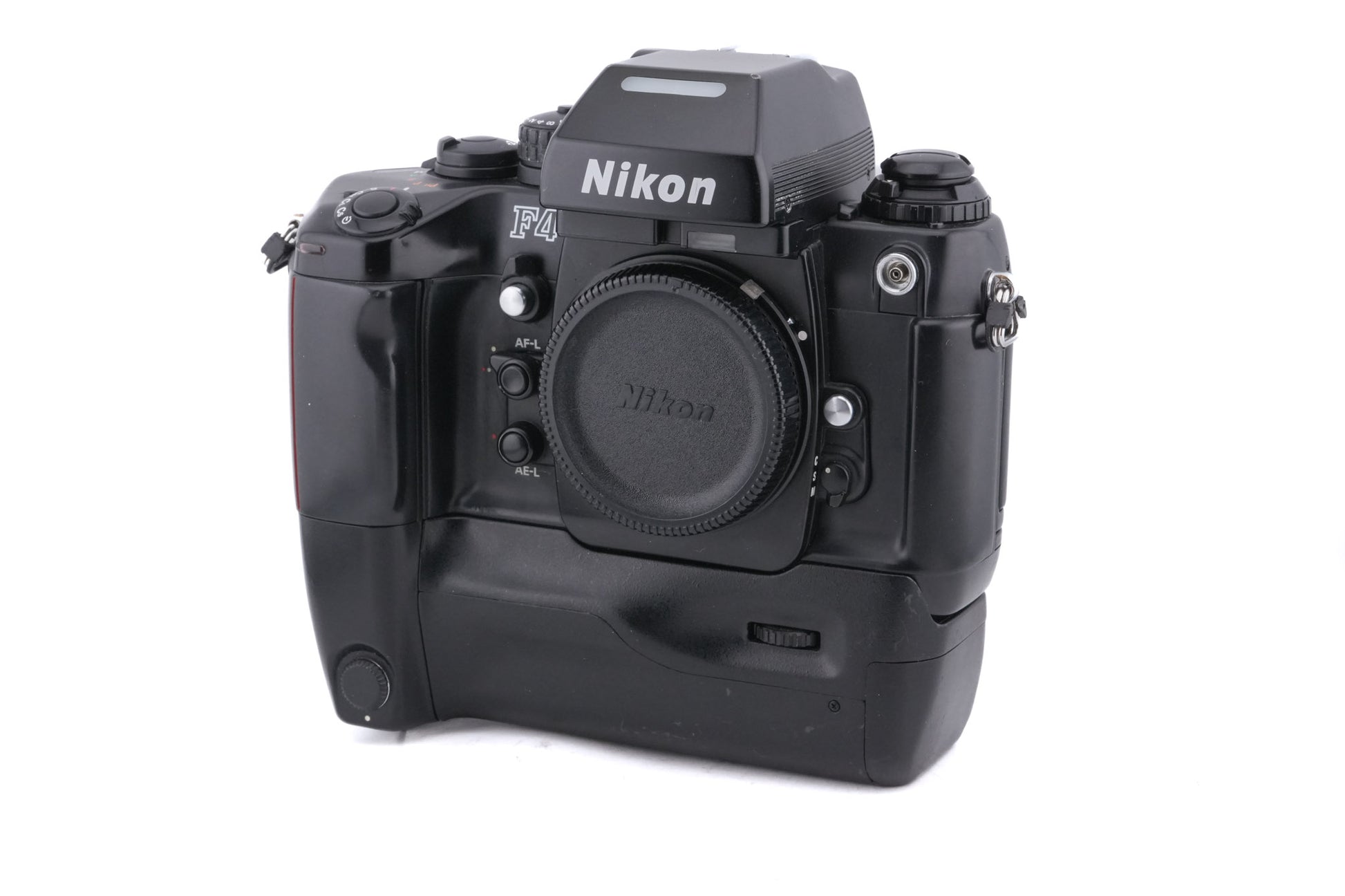 Autofocus F-mount 35mm SLR camera released by Nikon in 1988. The F4 is a pro-grade body with weather sealing, PSAM + Ph exposure modes, matrix metering with switchable center-weighted as well as spot modes, and a single point AF. It was the second professional autofocus camera Nikon made. All Nikon lenses are compatible with the F4 except the G-series lenses, which only work in program and shutter-priority modes. Image stabilization on VR lenses also cannot be activated. Matrix metering is supported even with the older AI and AI-S manual focus lenses. While all F4 bodies can take any of the three available battery grips, Nikon named the bodies differently depending on which grip the camera came with from the factory. Bodies are still identical across all variations: F4 (MB-20 w/ 4 batteries), F4s (MB-21 w/ 6 batteries), and F4e (MB-23 w/ 8 batteries). Other features include a self-timer, mirror lock-up, AE and AF lock buttons, automatic film rewind, 1/250s flash sync, and +/-2 exposure compensation. Metal and plastic body available in black.