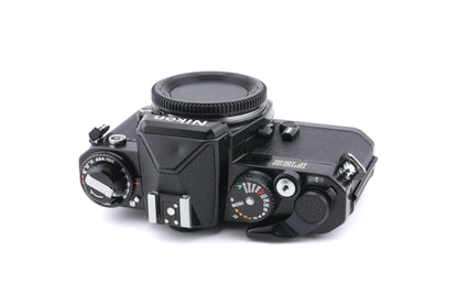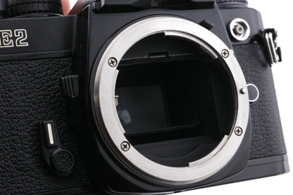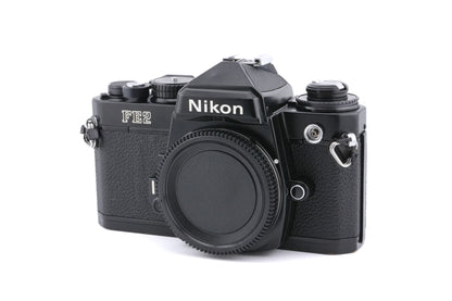 Manual focus F-mount 35mm SLR released by Nikon in 1983. The FE2 improved upon the FE by increasing the top shutter speed (1/4000s) and adding compatibility with certain TTL flashes. Metal body available in black and silver.