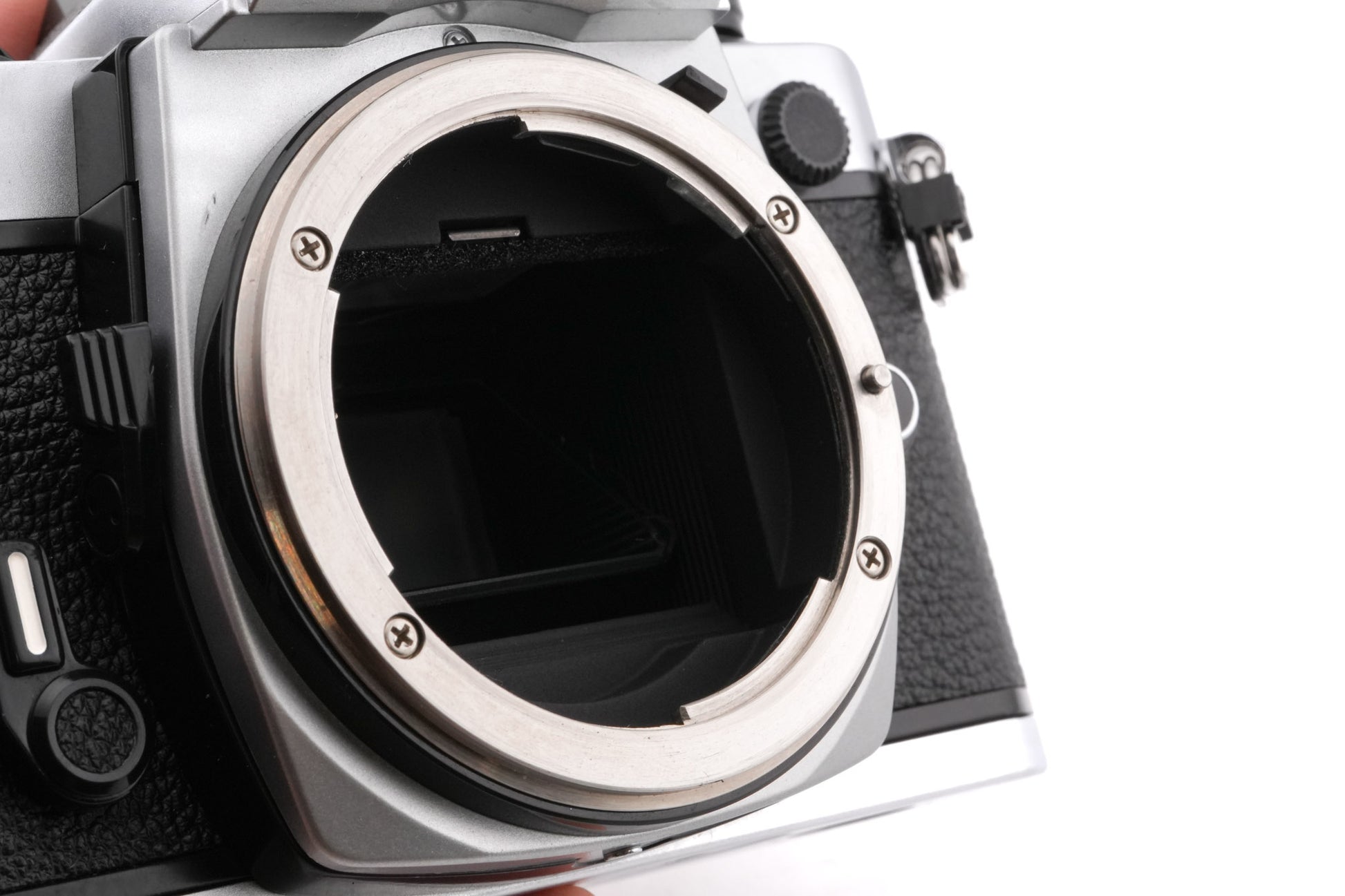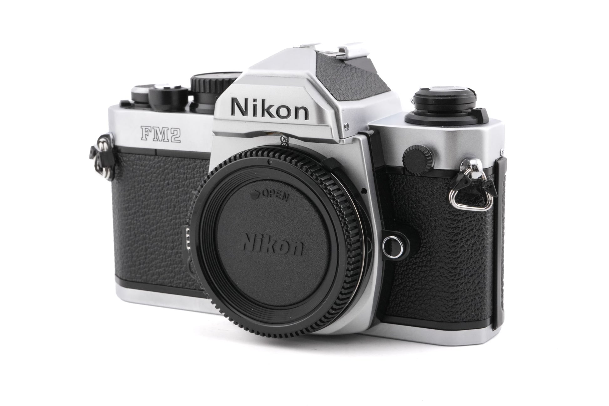 Manual focus 35mm F-mount SLR released by Nikon in 1982. It improved upon the original FM by adding a faster maximum shutter speed and improving flash sync speed. It has a built-in LED display light meter which requires a battery to operate. Otherwise, the camera is fully mechanical. Made with both titanium and aluminum shutters depending on year of production. Metal body available in black & silver.
