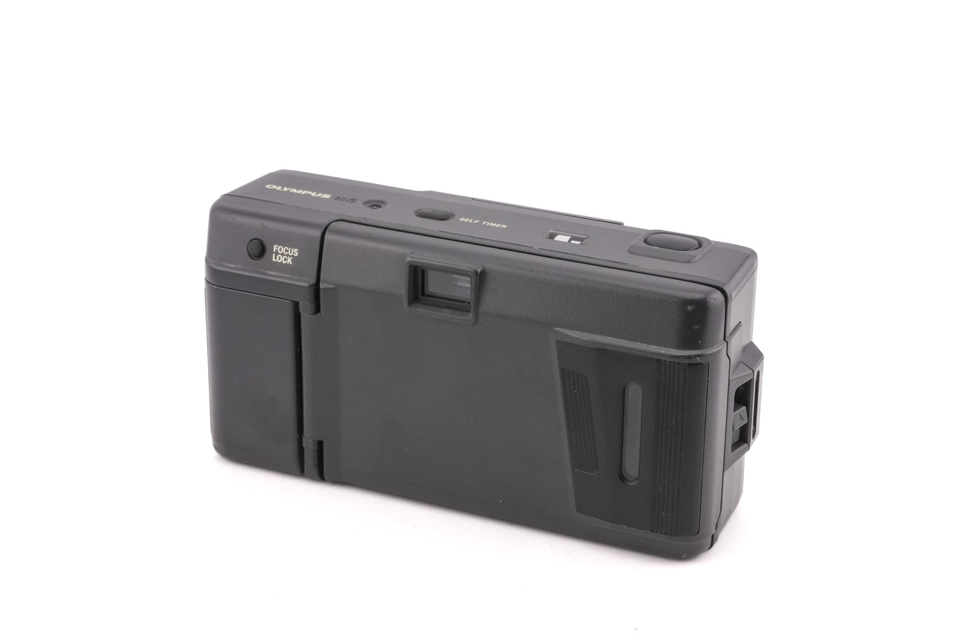 Autofocus 35mm point-and-shoot camera released by Olympus in 1986. It was the world's first weatherproof fully automatic 35mm compact camera. It has a built-in flash and a self-timer. Plastic body available in dark gray.