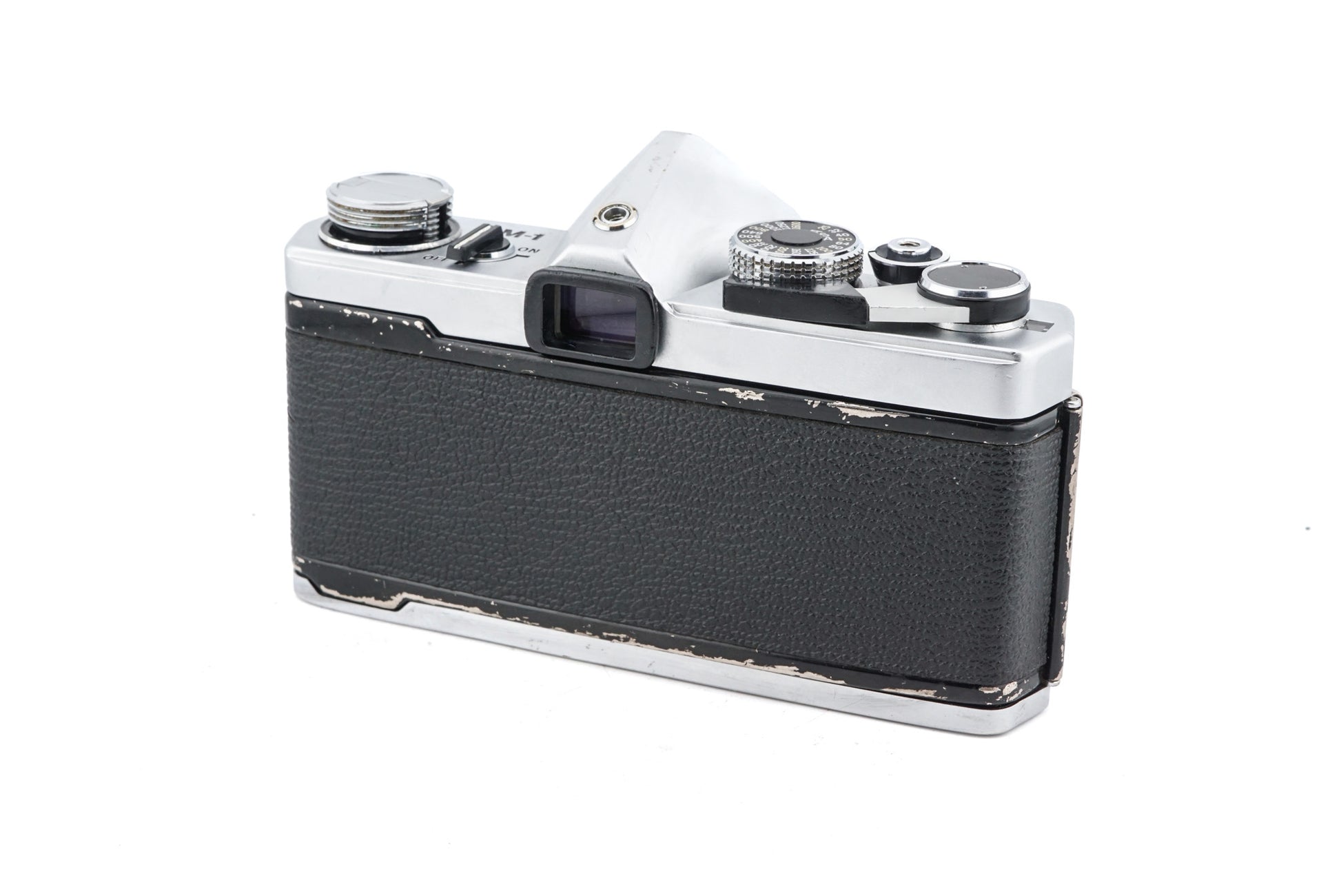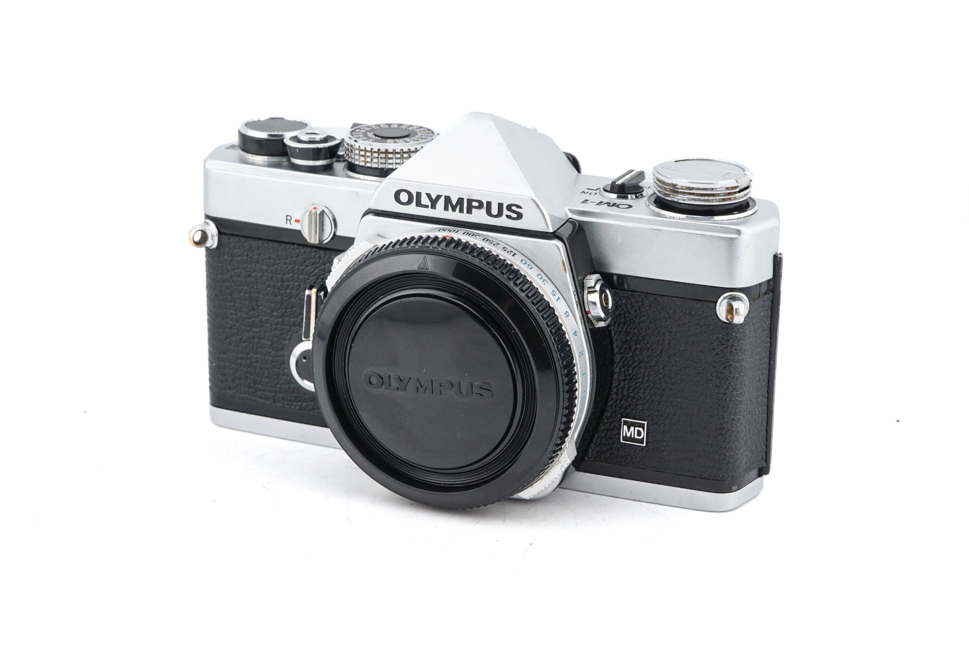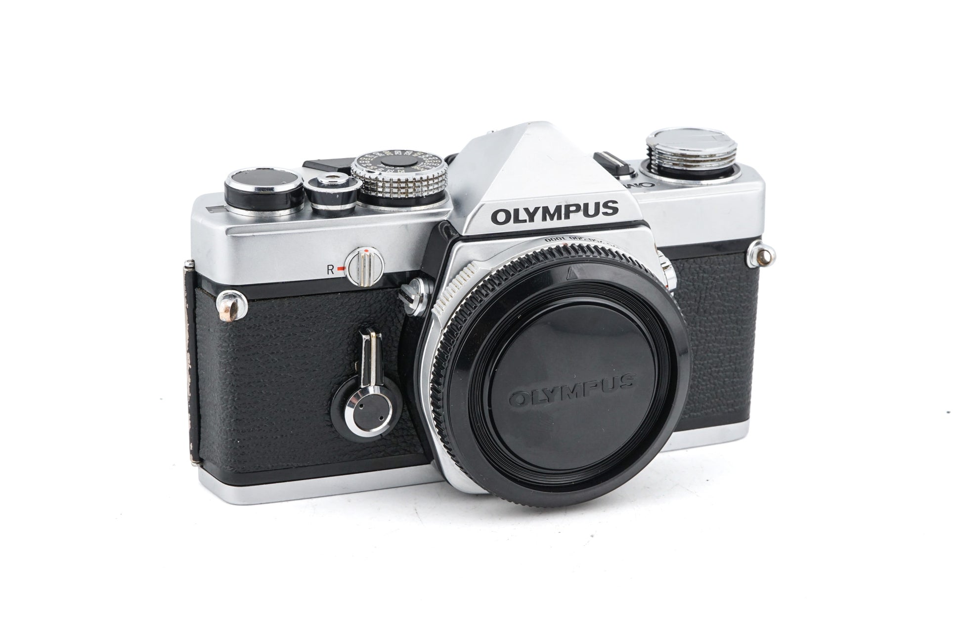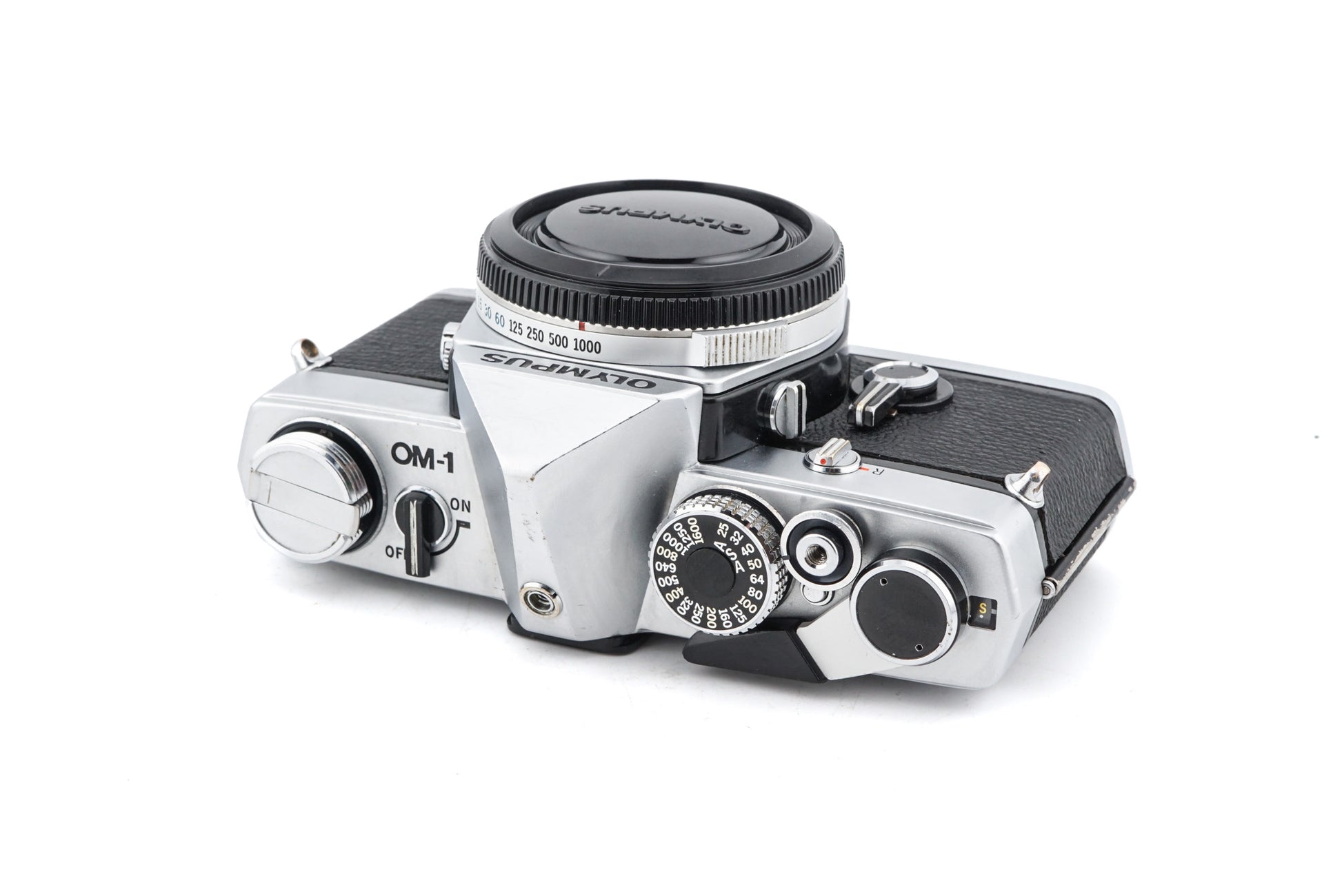 Manual focus OM-mount 35mm SLR released by Olympus in 1972. It changed the entire 35mm SLR market by fitting professional-quality features in a compact body. It has a mirror lock-up and a self-timer. The battery powers only the light meter. This is the earliest version of the OM-1 and lacks support for a motor drive. Metal body available in both black and silver.