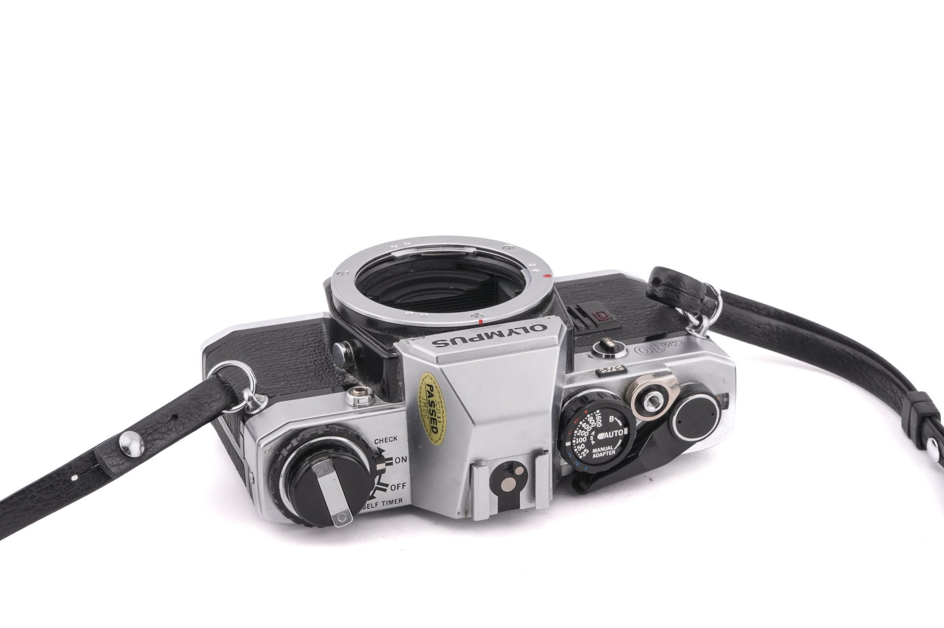Manual focus OM-mount 35mm SLR released by Olympus in 1979. This was the first of Olympus' 2-digit OM series aimed at consumers instead of professionals. Fires only in aperture priority mode unless the optional manual adapter is attached. It has a self-timer, a hot shoe, and +/- 2 exposure compensation. Metal body available in silver.
