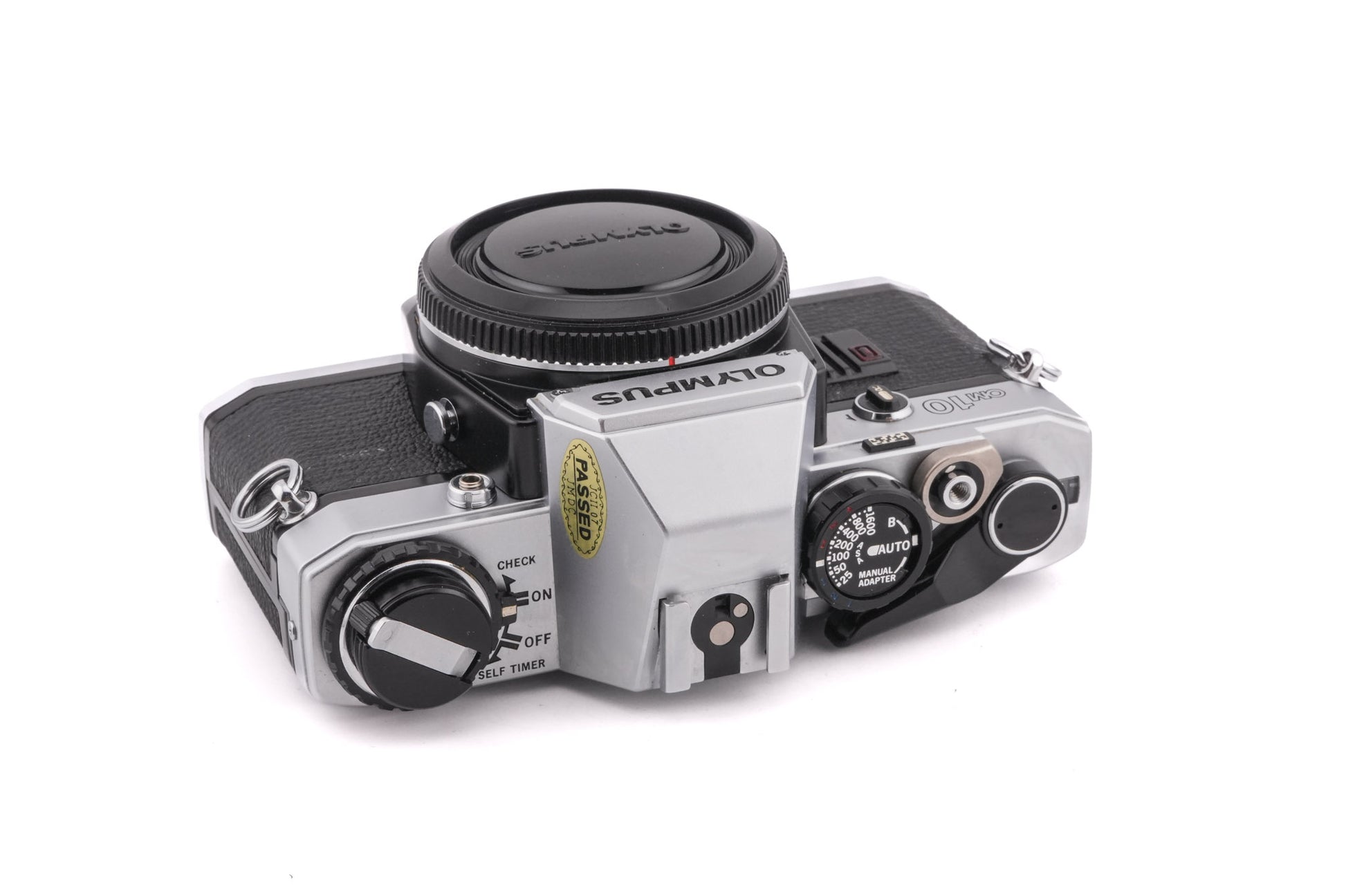 Manual focus OM-mount 35mm SLR released by Olympus in 1979. This was the first of Olympus' 2-digit OM series aimed at consumers instead of professionals. Fires only in aperture priority mode unless the optional manual adapter is attached. It has a self-timer, a hot shoe, and +/- 2 exposure compensation. Metal body available in silver.