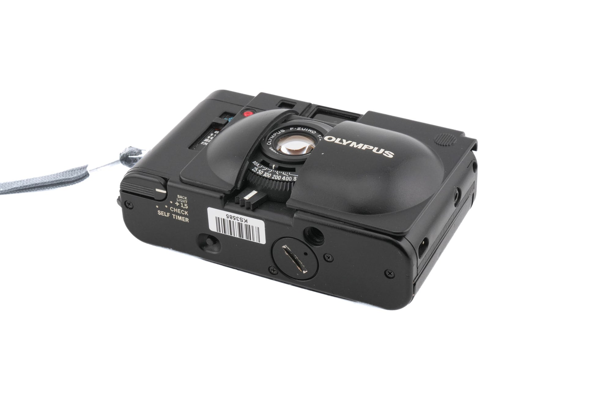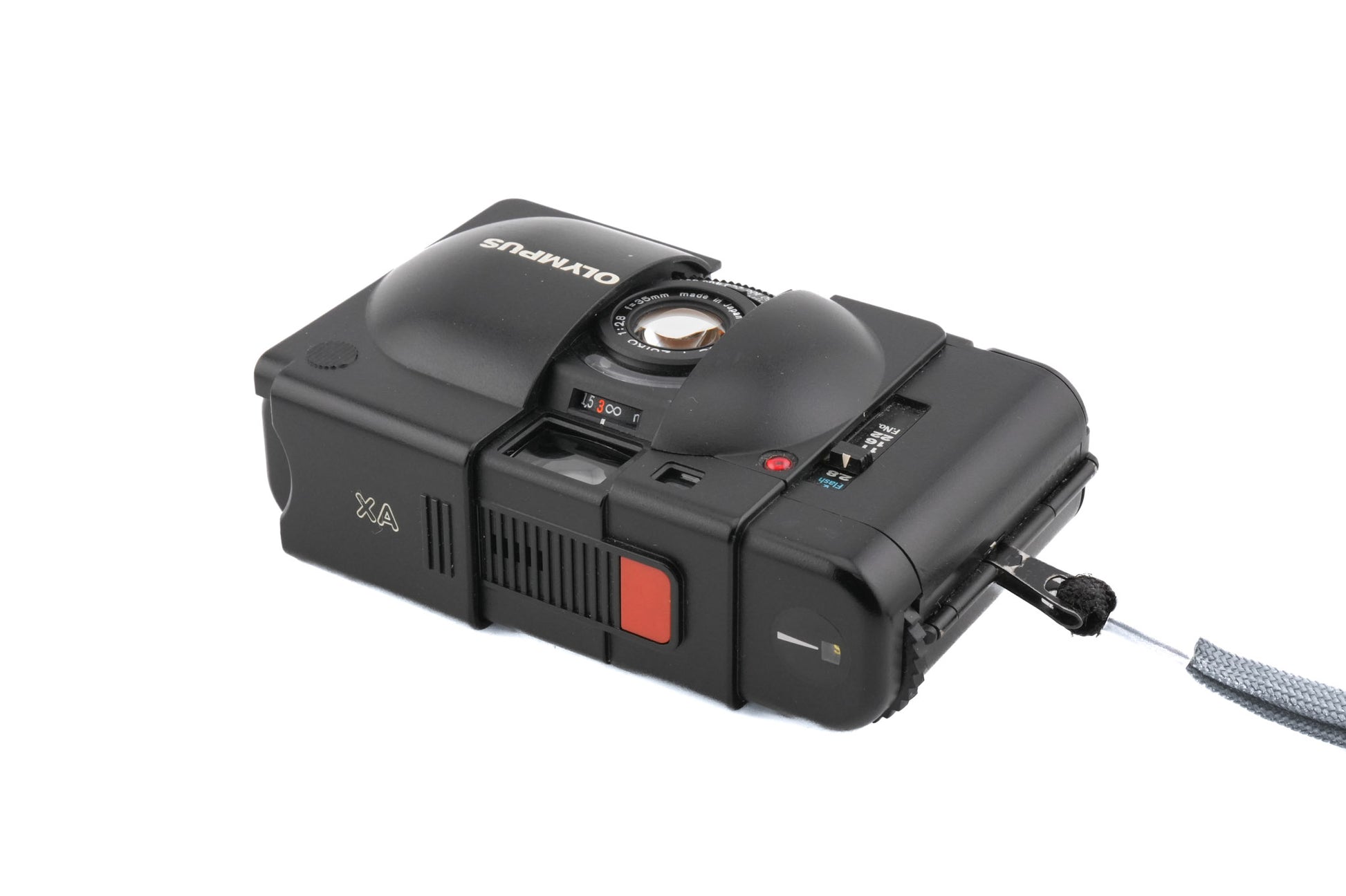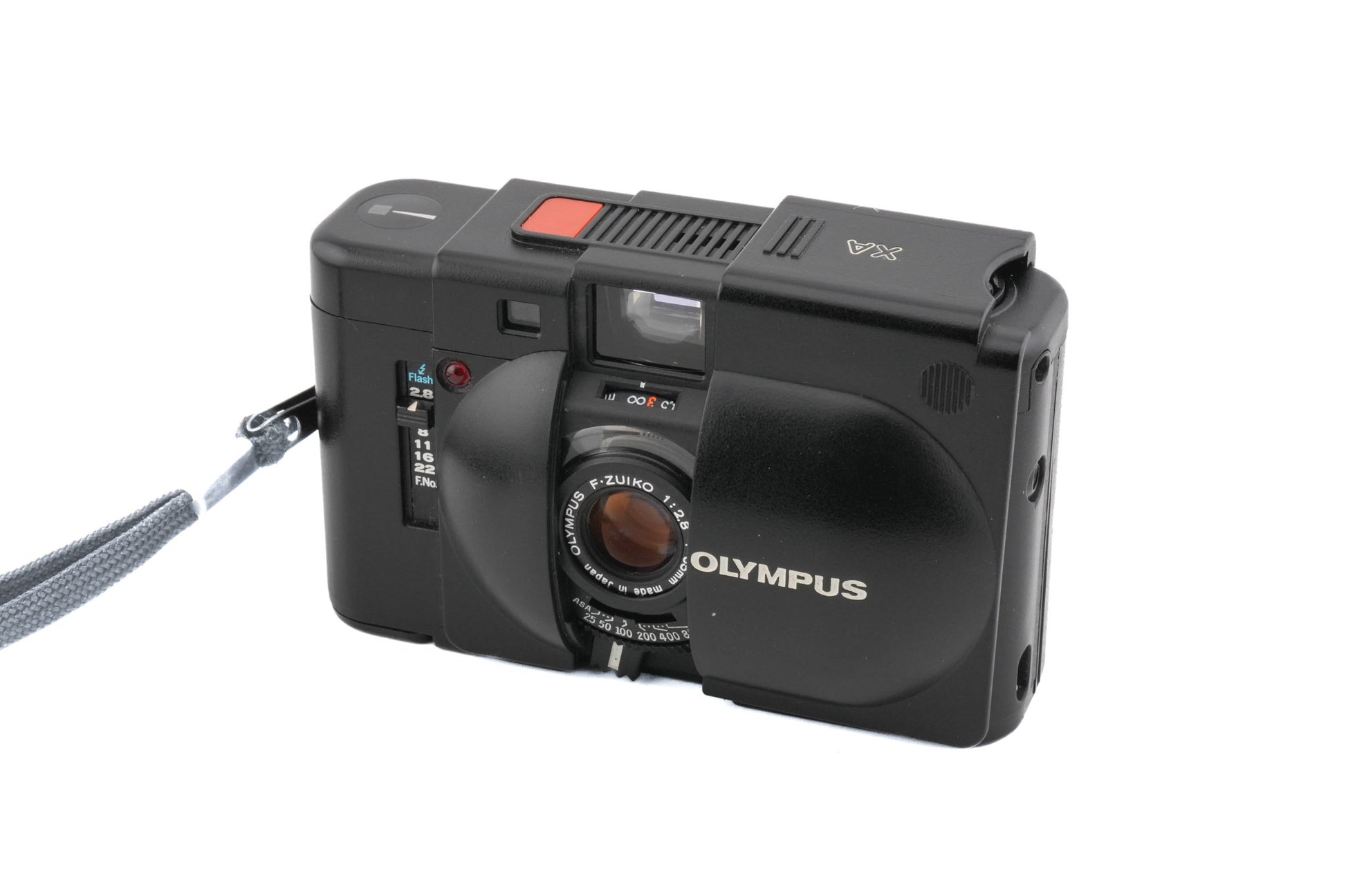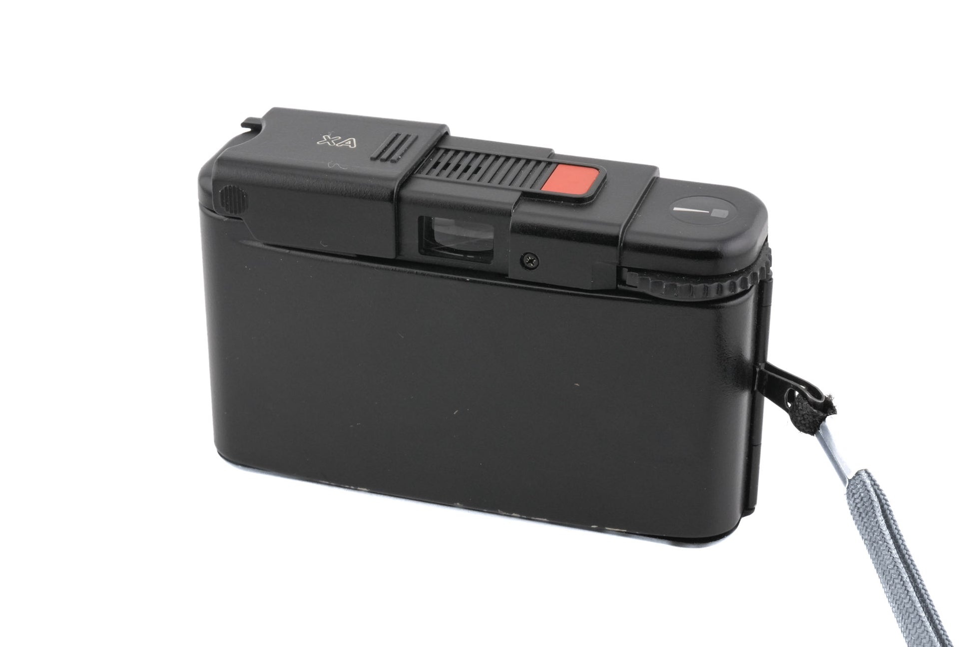 Manual focus 35mm rangefinder camera released by Olympus in 1979. The XA was designed by Yoshihisa Maitani, who also designed the OM-1 SLR. It is capable of aperture priority auto exposure using a built-in CdS light meter. The clamshell lens cover functions as the power switch. A switch on the bottom of the camera allows for backlight compensation (+1.5 stops), battery check, and self-timer. A detachable flash can be attached to the side of the body. Plastic body available in black.