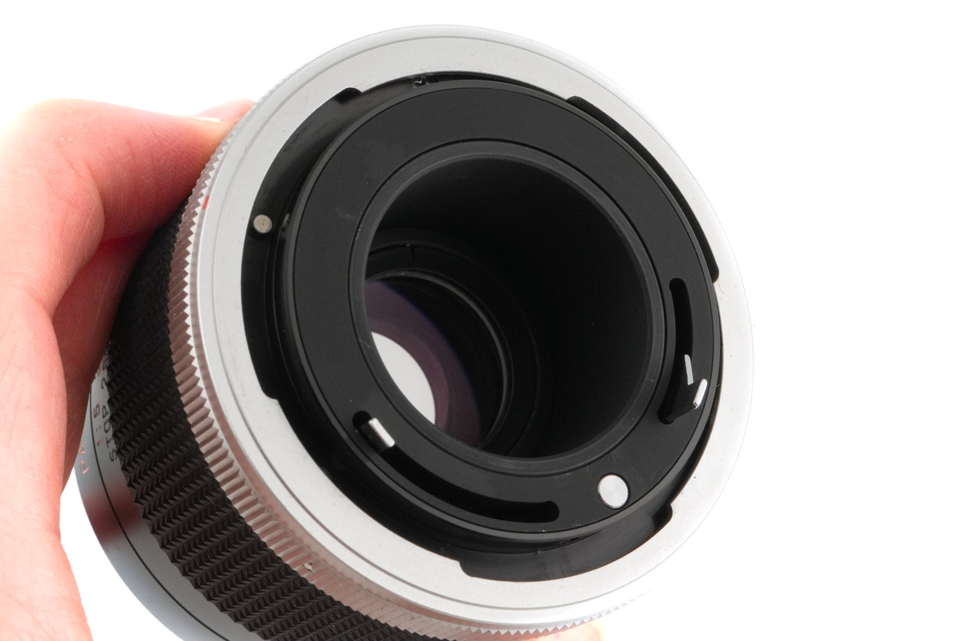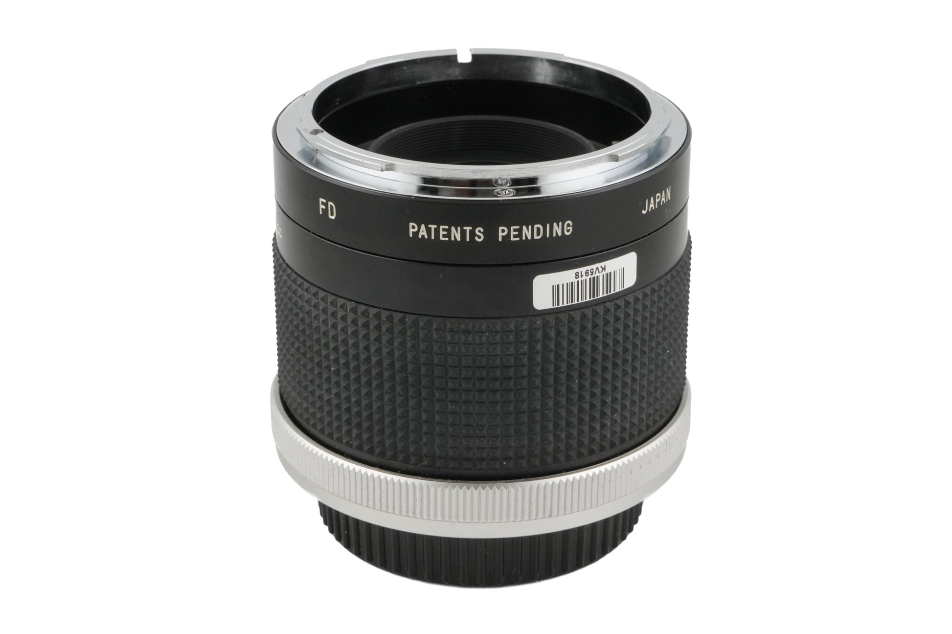 Macro converter made by Panagor for all Canon FD mount 35mm SLRs. Doubles your focal length and allows for 1:1 macro reproduction with 50mm lenses using its own focusing helicoid. Black metal body with silver breech lock.