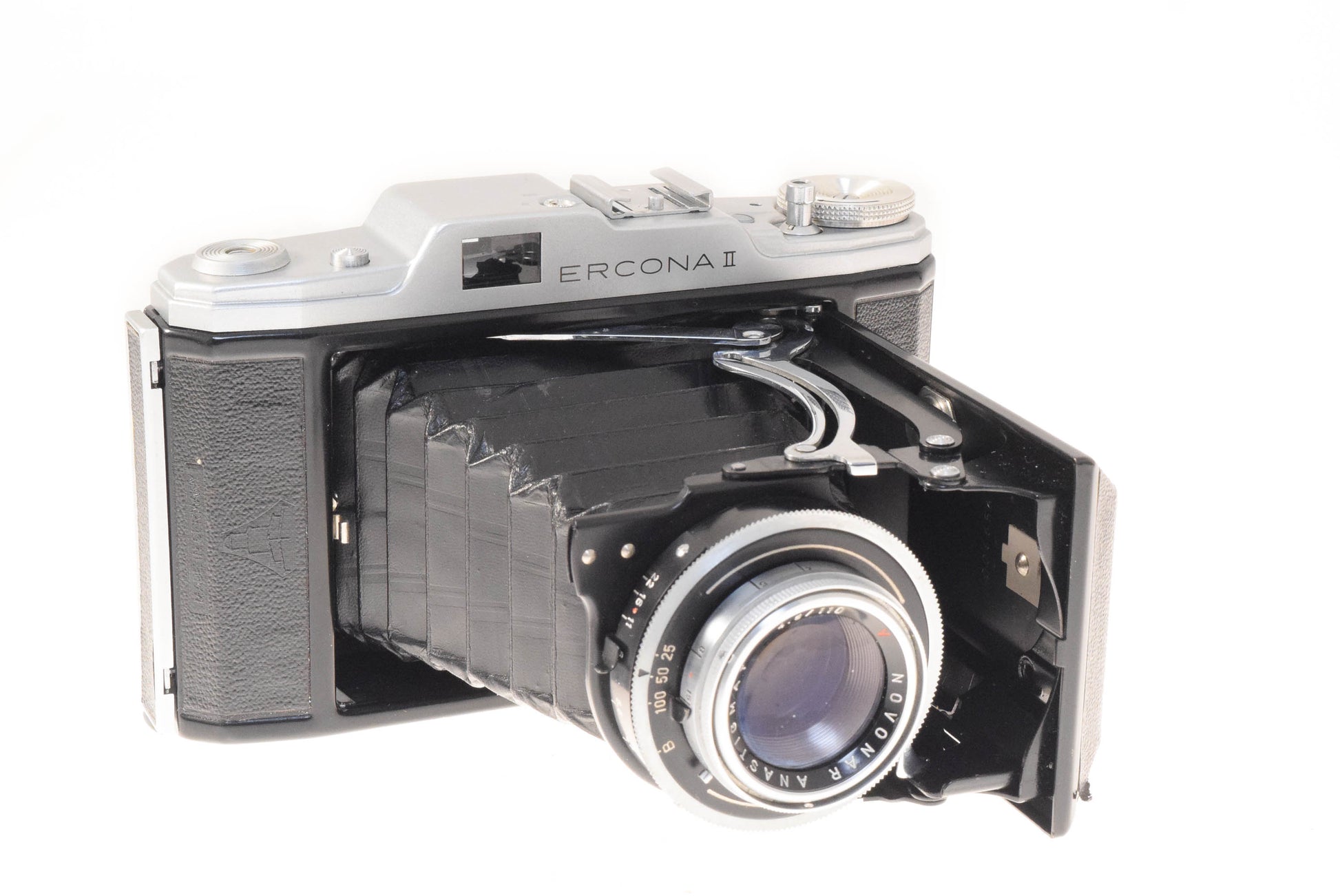 6x9 folder camera based on Ikonta 521/2 camera. Successor of Ercona I model. Available with two lens options: 110mm f4.5 Novonar Anastigmat and 105mm f3.5 Tessar. These cameras were equipped with two red windows, a removable 6x6 mask in the film chamber and an additional flip-up square mask in the finder.