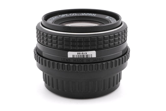 Manual focus normal lens made for K-mount 35mm SLR cameras by Pentax. It does not work with the automatic modes of later Pentax models. Plastic/metal body available in black.