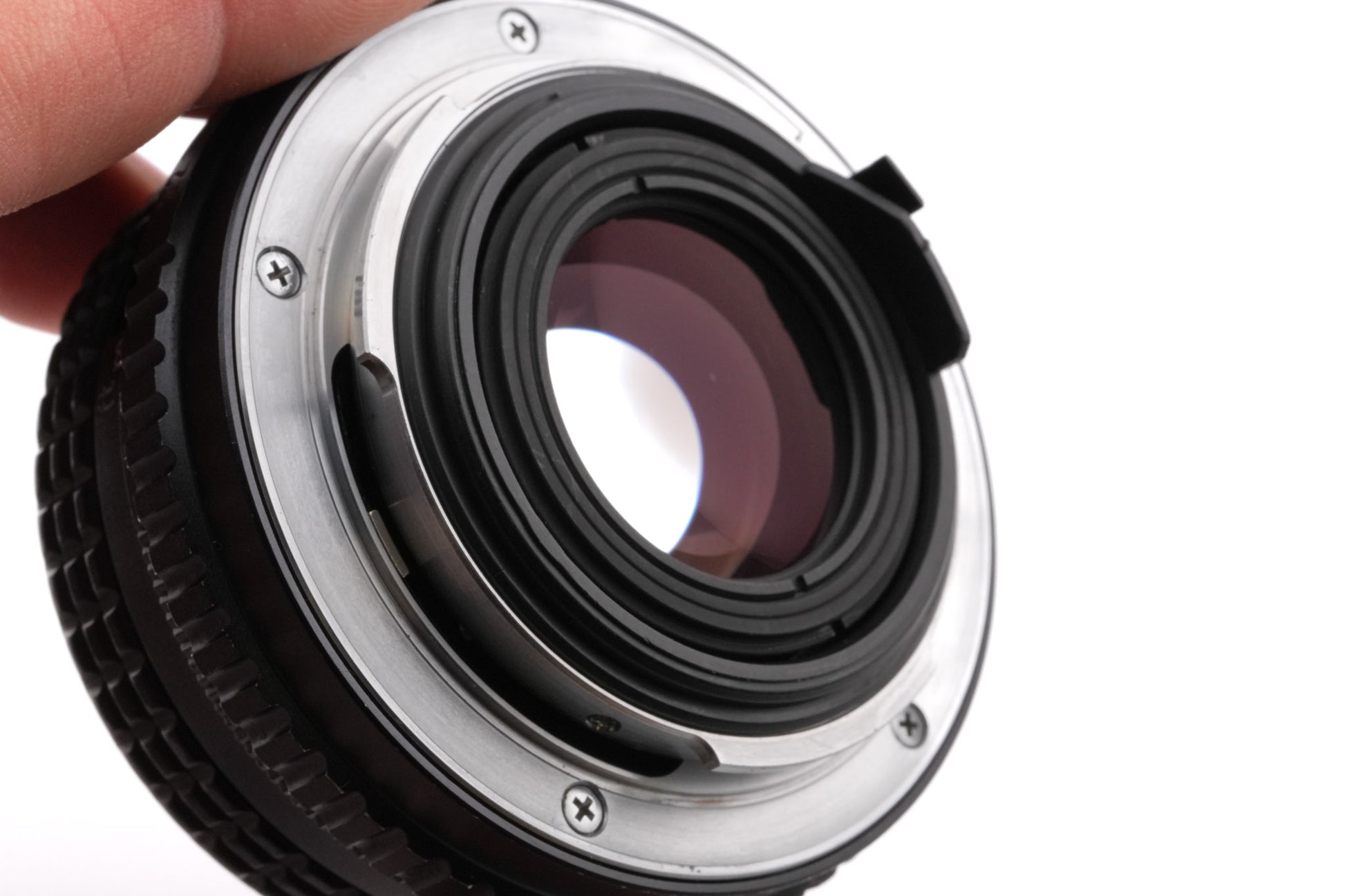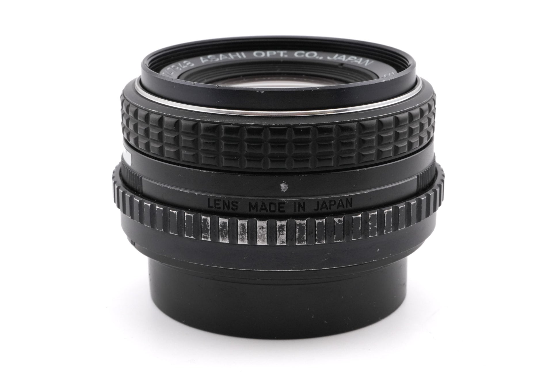 Manual focus normal lens made for K-mount 35mm SLR cameras by Pentax. It does not work with the automatic modes of later Pentax models. Plastic/metal body available in black.