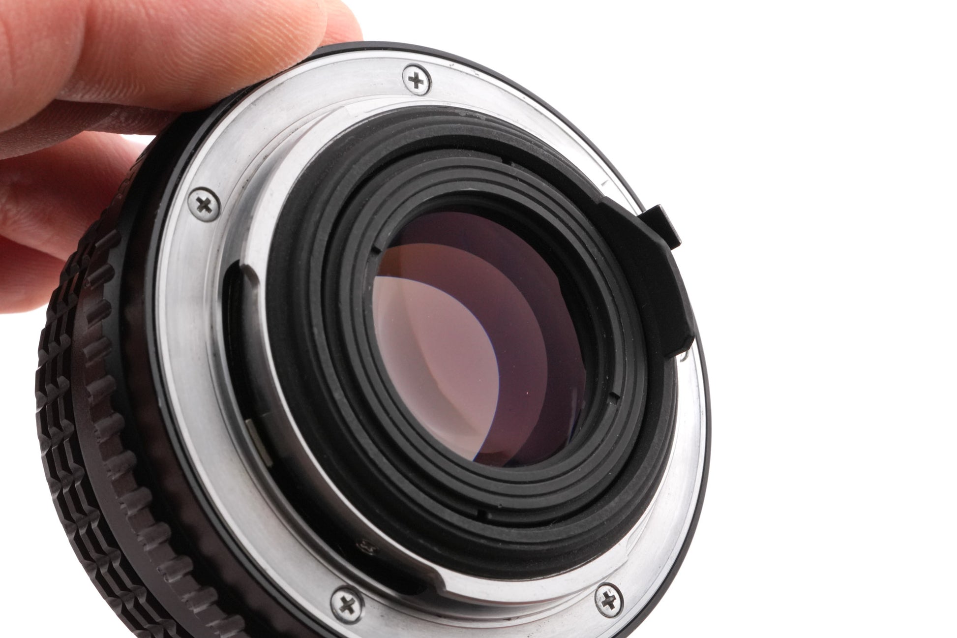 Manual focus normal lens made for K-mount 35mm SLR cameras by Pentax. It does not work with the automatic modes of later Pentax models. Plastic/metal body available in black.