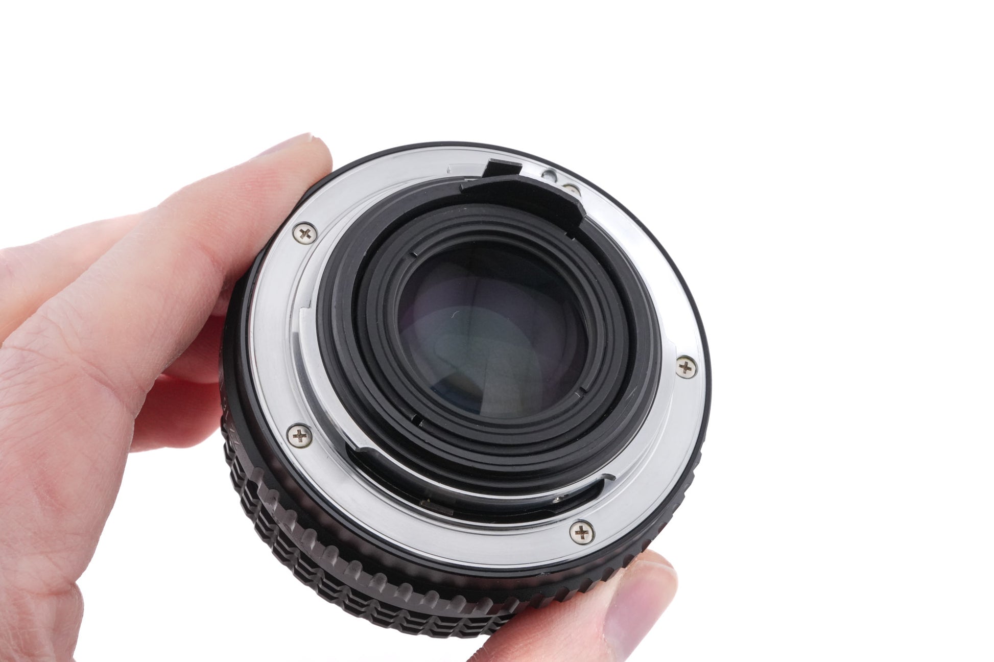 Manual focus normal lens made for K-mount 35mm SLR cameras by Pentax. It does not work with the automatic modes of later Pentax models. Plastic/metal body available in black.