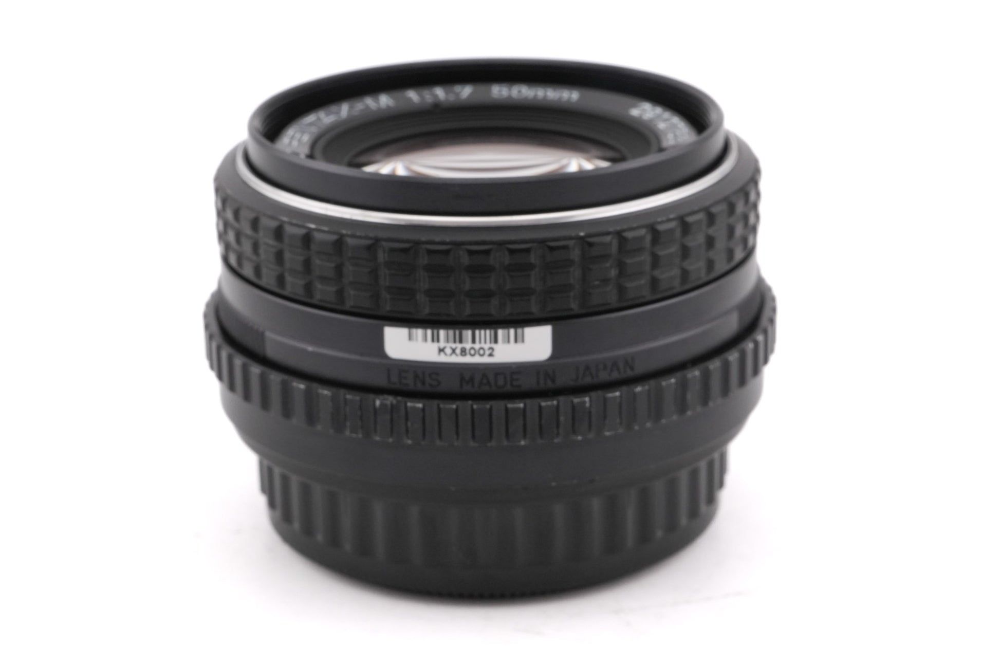 Manual focus normal lens made for K-mount 35mm SLR cameras by Pentax. It does not work with the automatic modes of later Pentax models. Plastic/metal body available in black.
