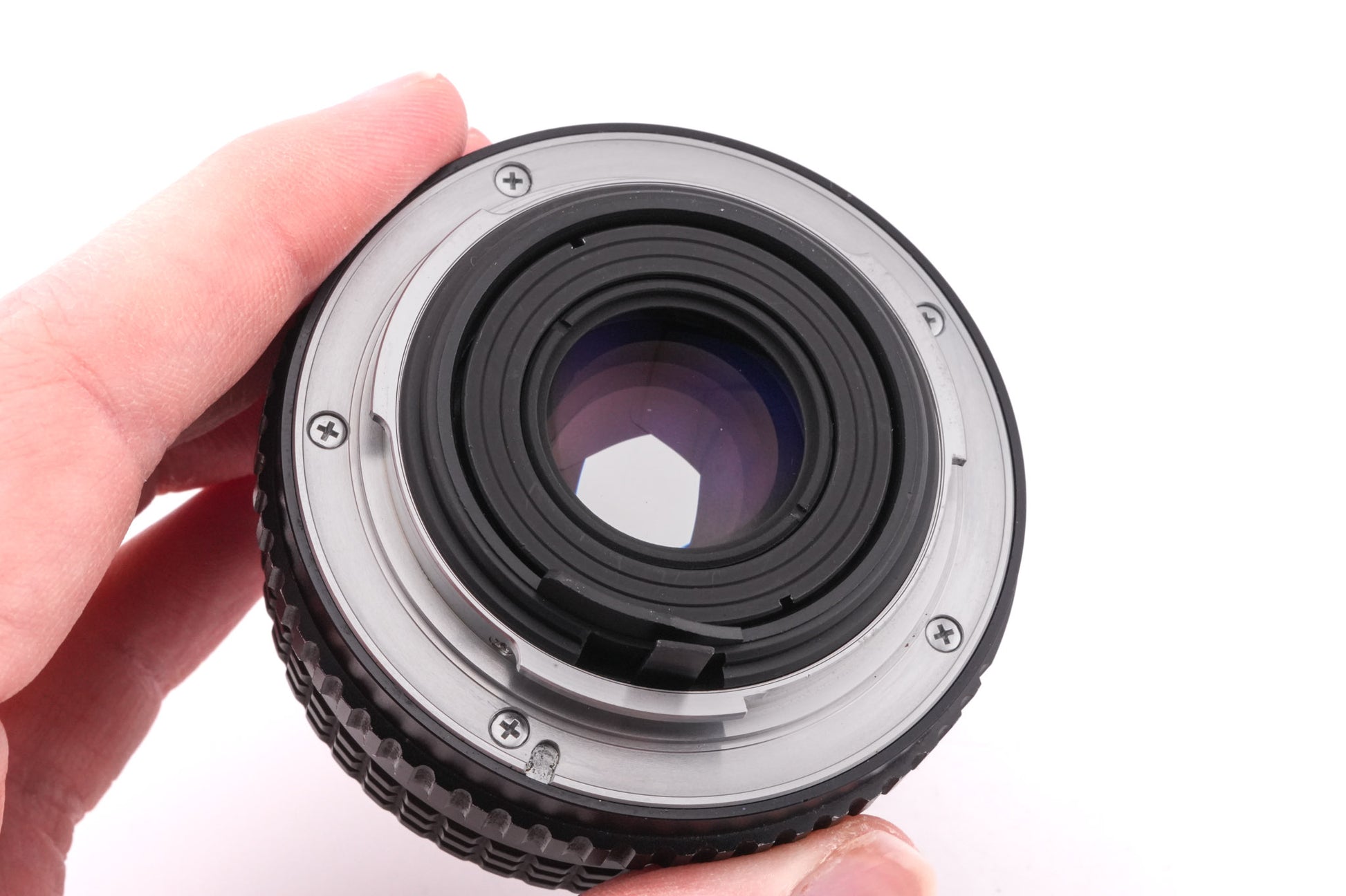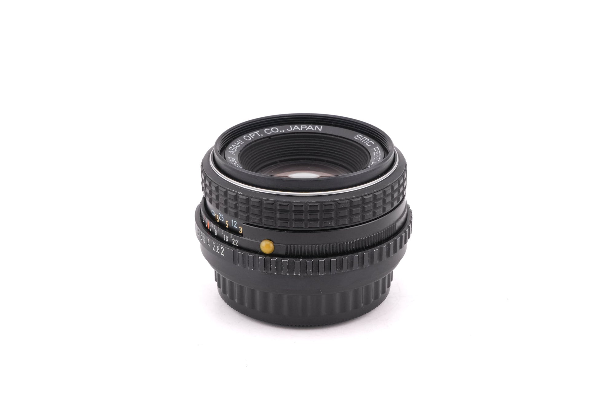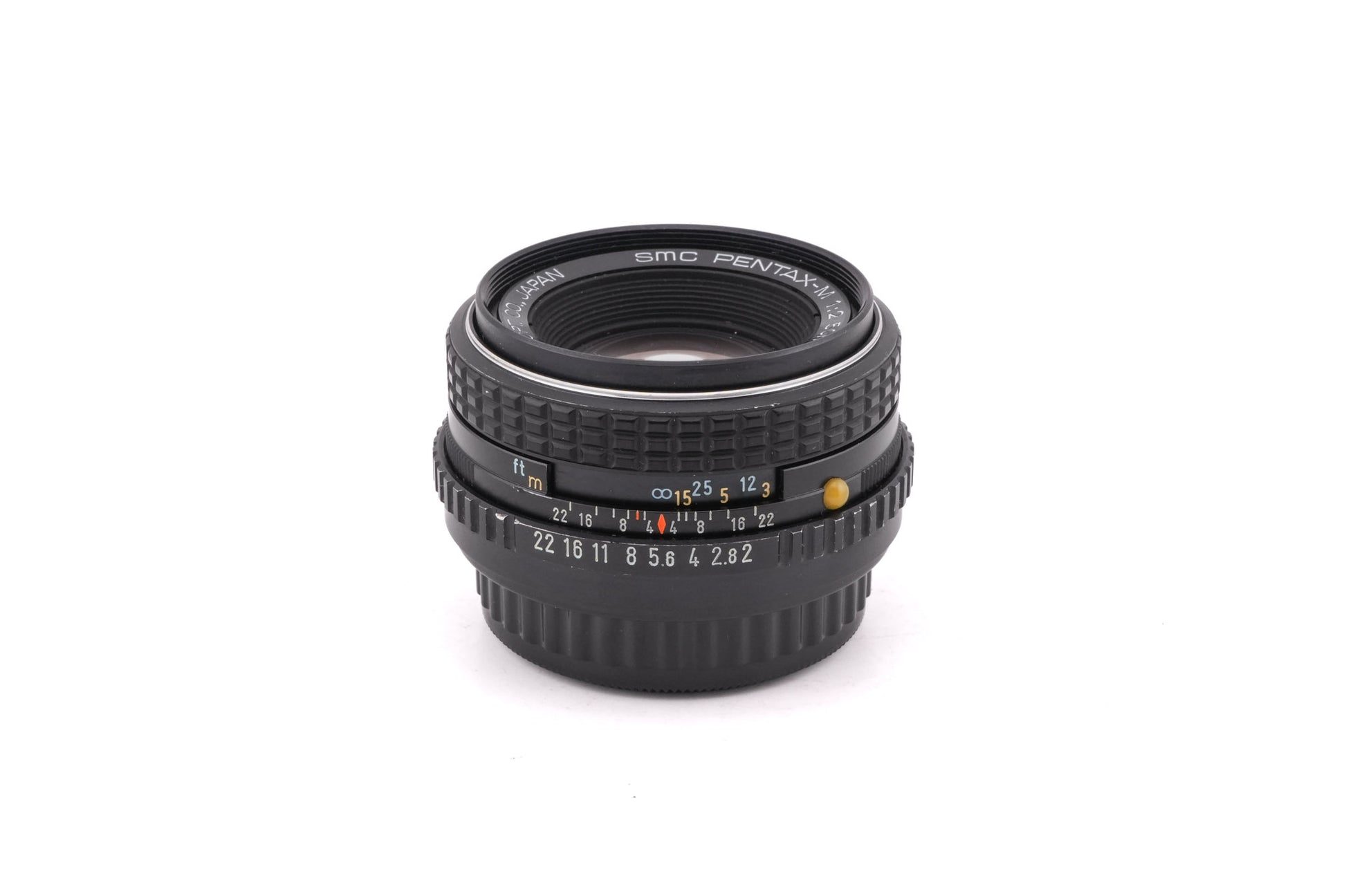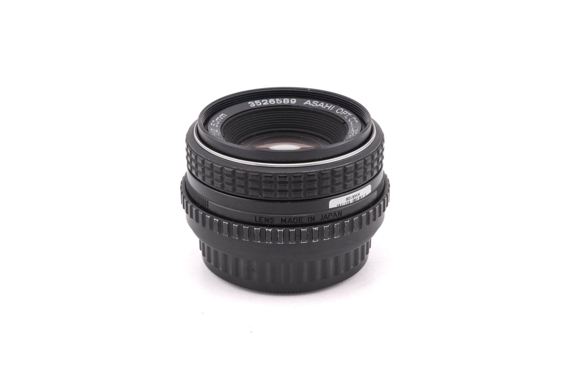 Manual focus normal lens made for K-mount 35mm SLR cameras introduced by Pentax. Early models were all-metal, but after the release of the Pentax-A line, some plastic parts were used. Metal and plastic body available in black.