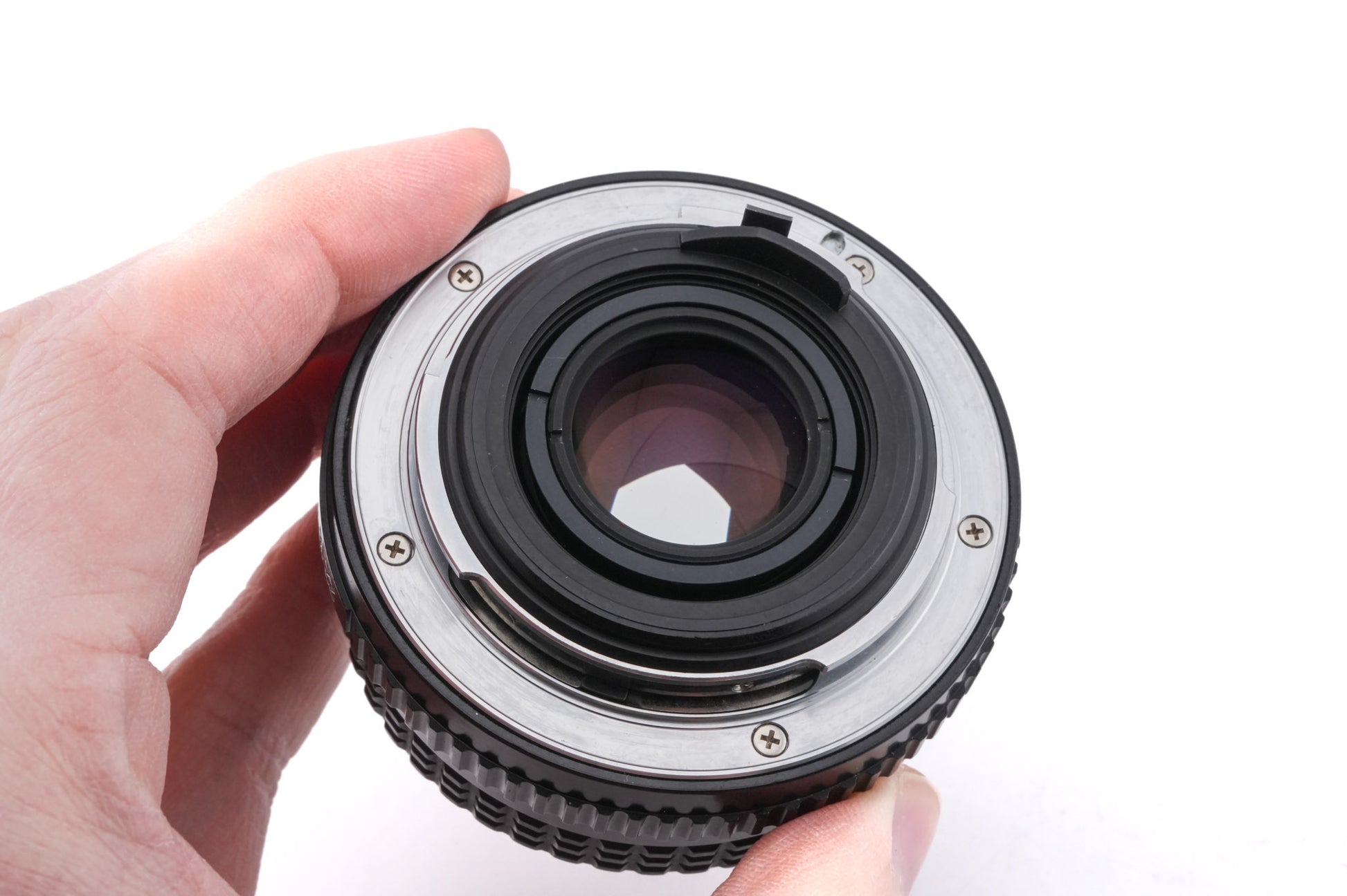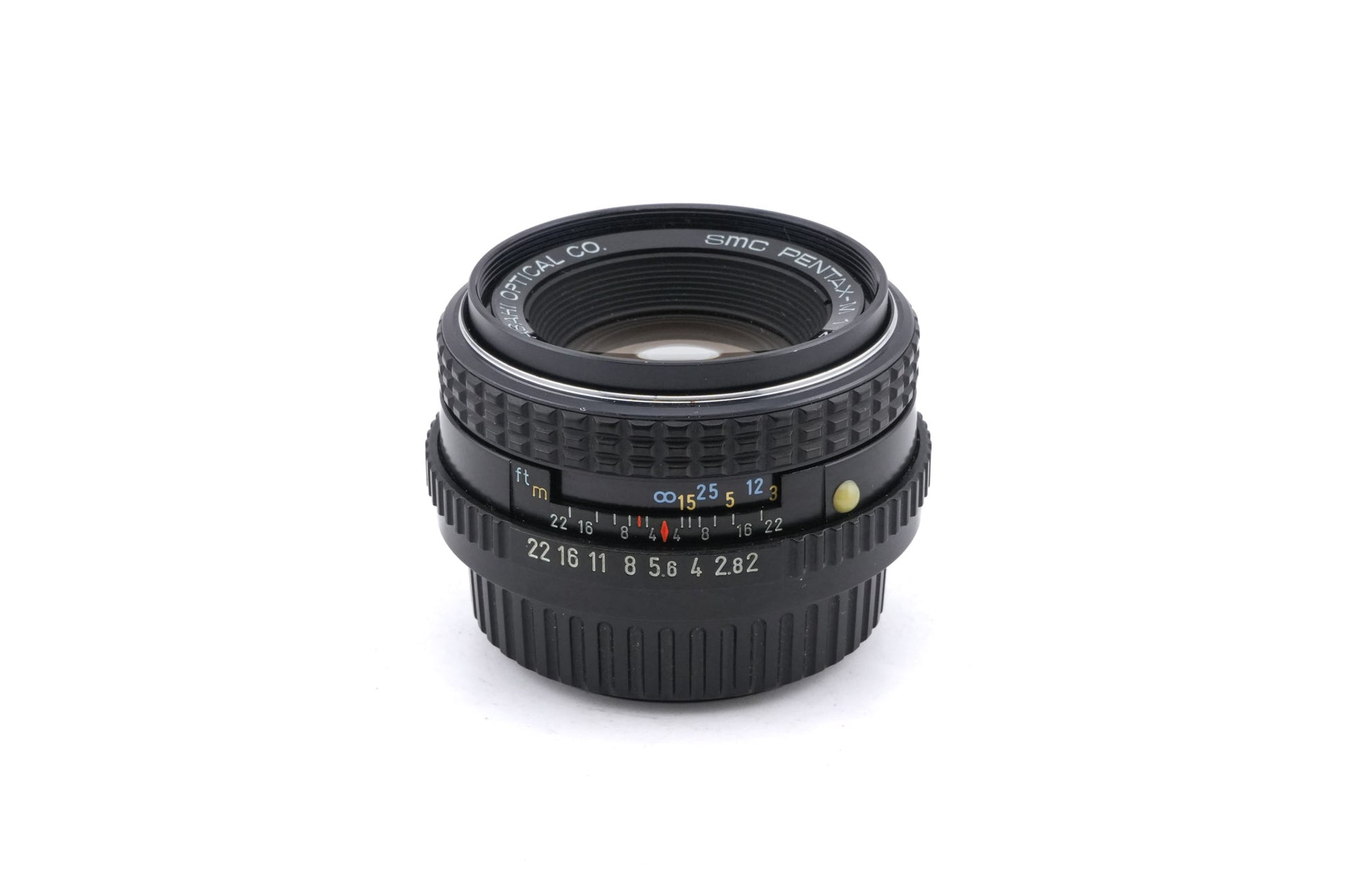Manual focus normal lens made for K-mount 35mm SLR cameras introduced by Pentax. Early models were all-metal, but after the release of the Pentax-A line, some plastic parts were used. Metal and plastic body available in black.
