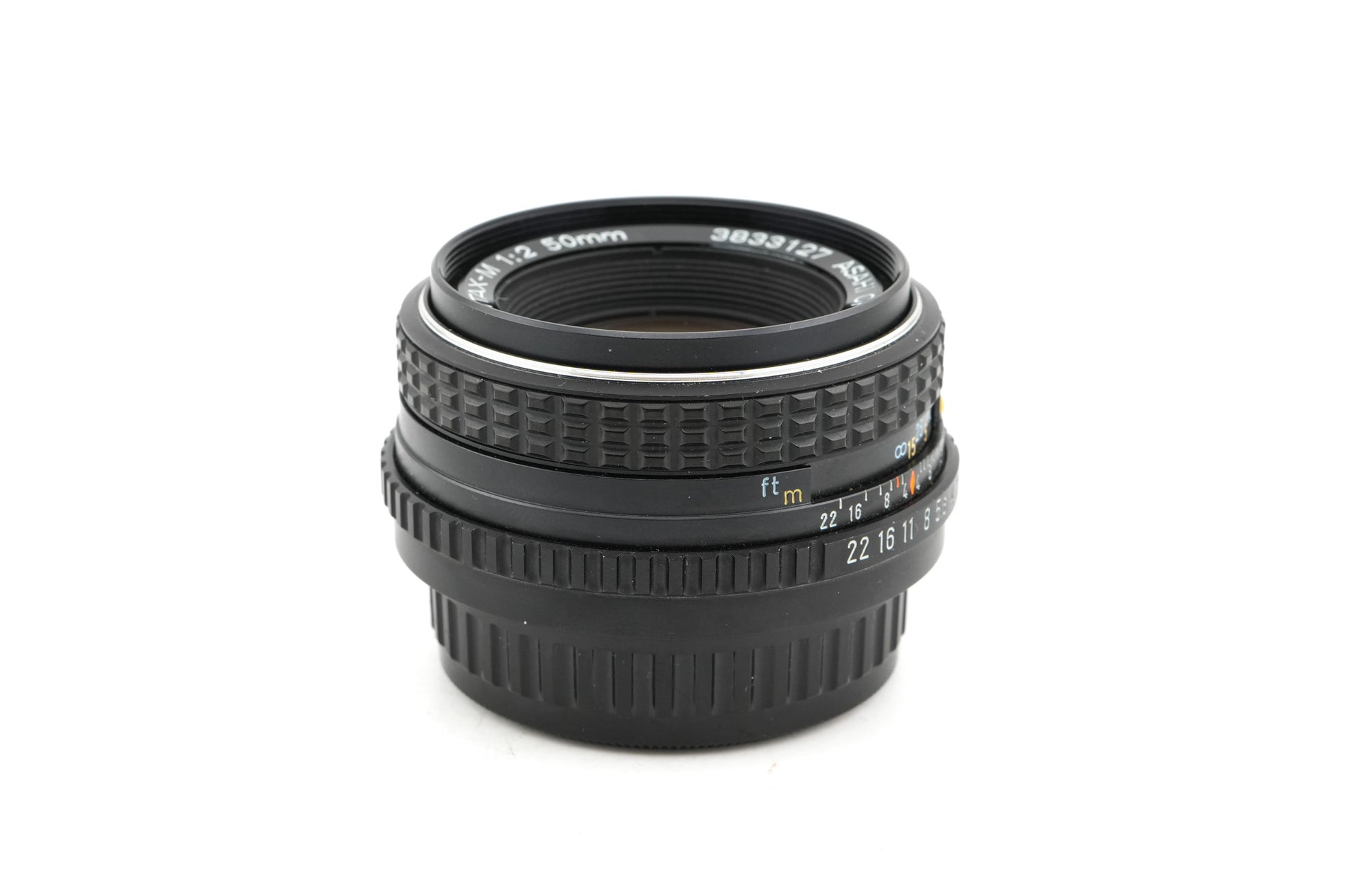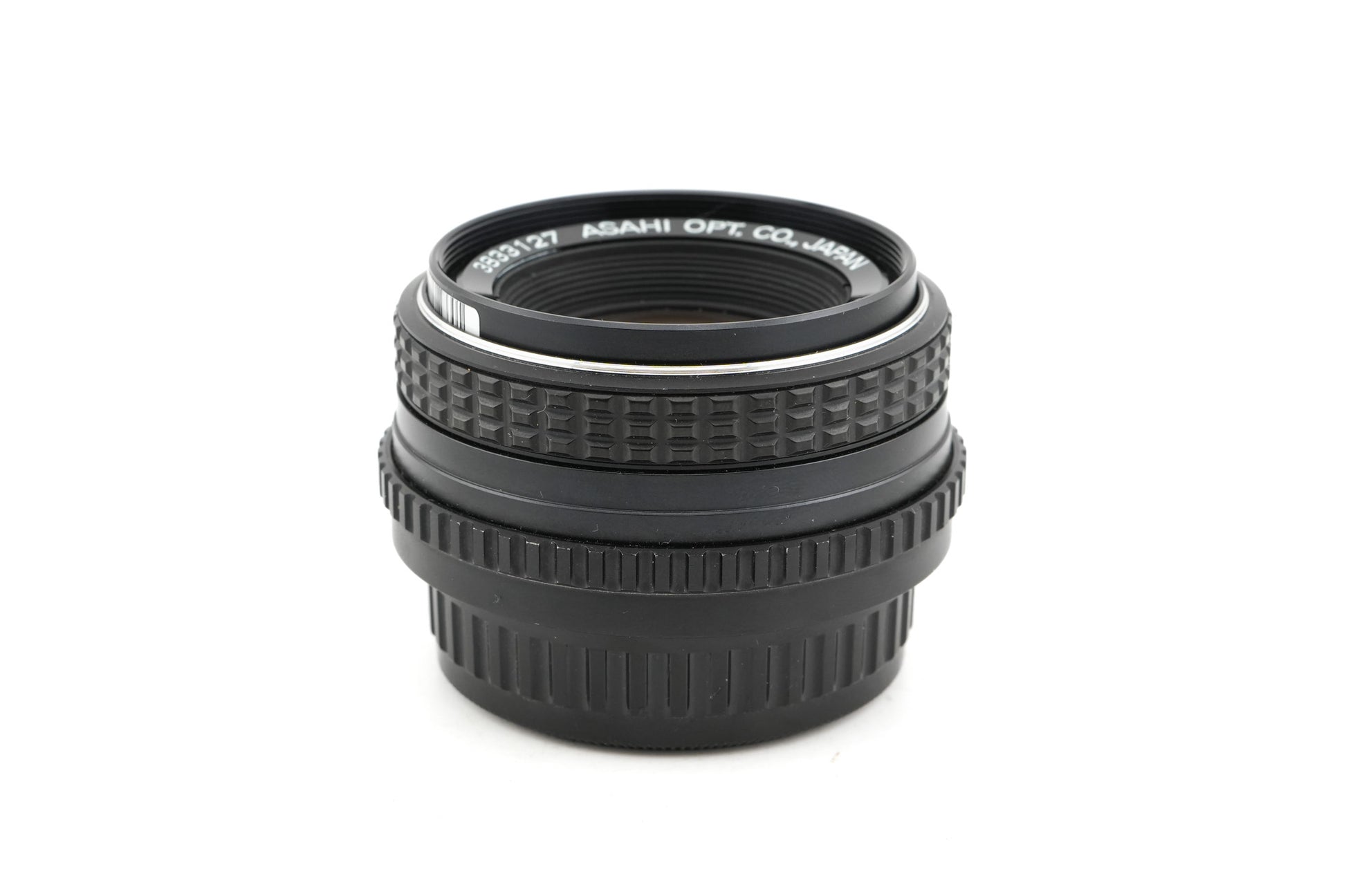 Manual focus normal lens made for K-mount 35mm SLR cameras introduced by Pentax. Early models were all-metal, but after the release of the Pentax-A line, some plastic parts were used. Metal and plastic body available in black.