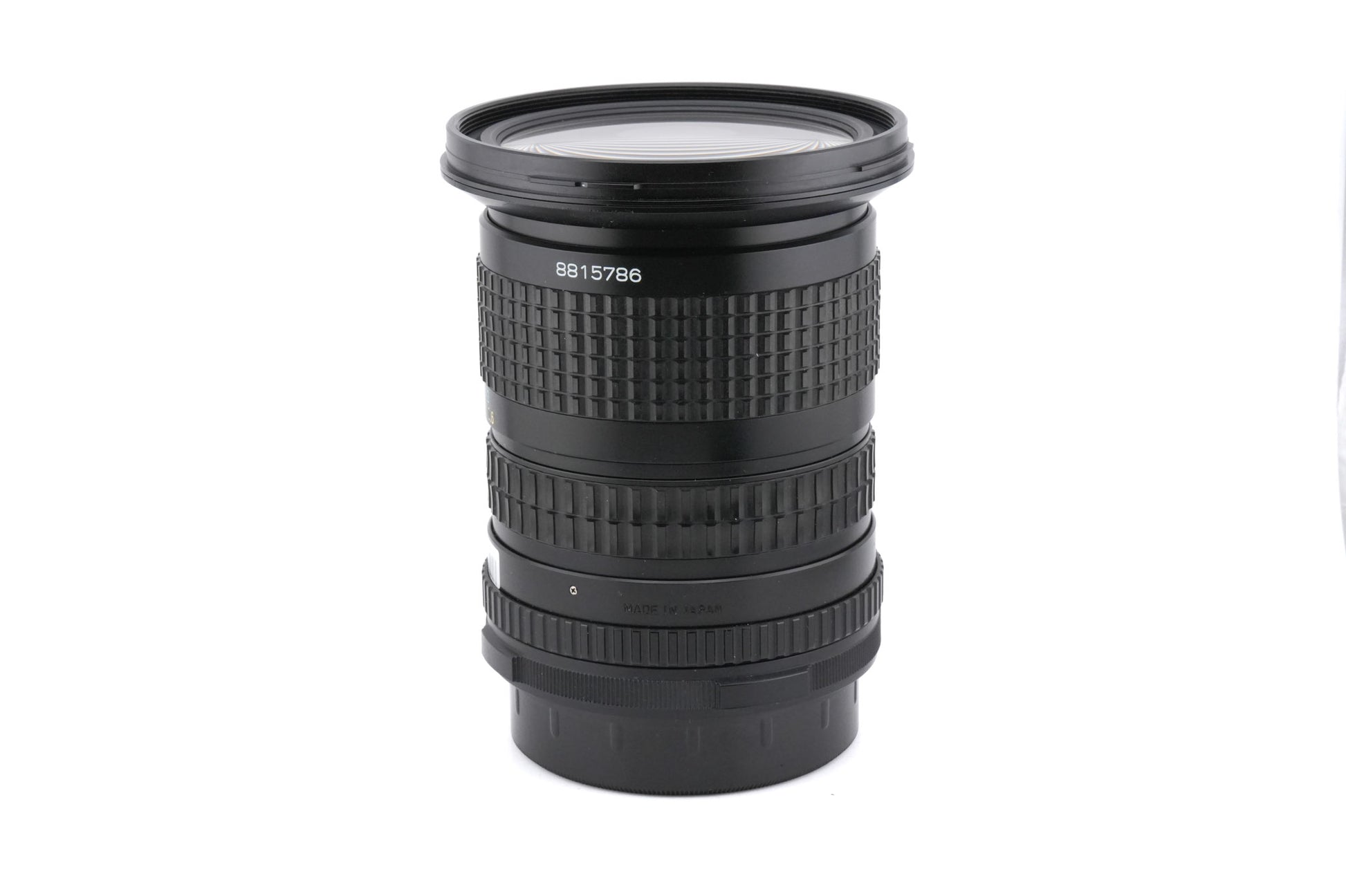 Manual focus wide angle zoom lens made for the Pentax 6x7 mount medium format cameras by Pentax. This two-touch design is the only zoom made for Pentax 6x7 cameras. Gives the equivalent focal length of 27.5-50mm. Has a dedicated lens hood that attaches via bayonet. Metal body available in black.