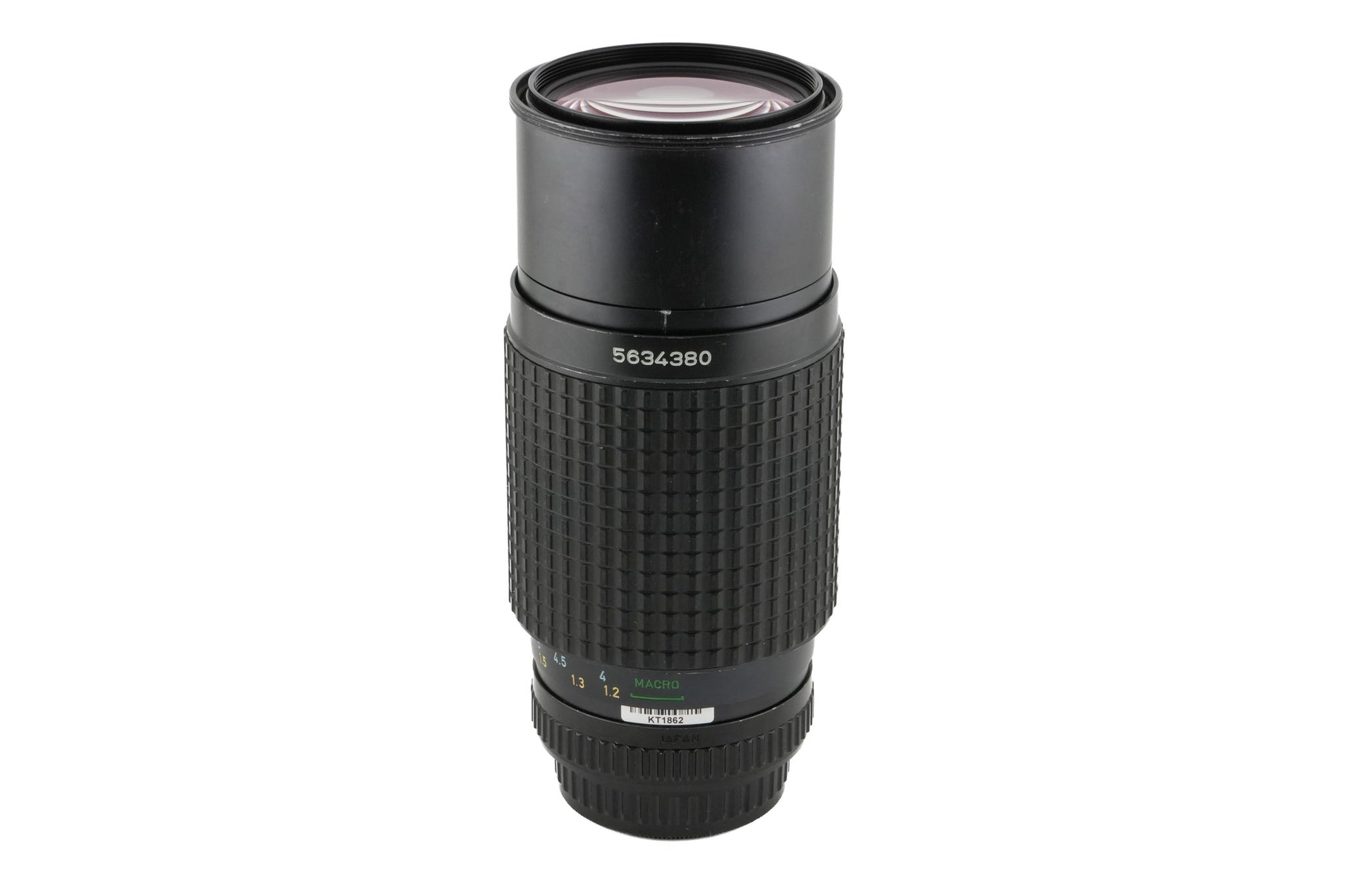 Manual focus telephoto push-pull zoom lens made for K-mount 35mm SLR cameras introduced by Pentax. It has a built-in lens hood. Metal body available in black.