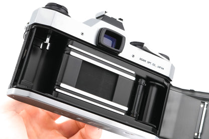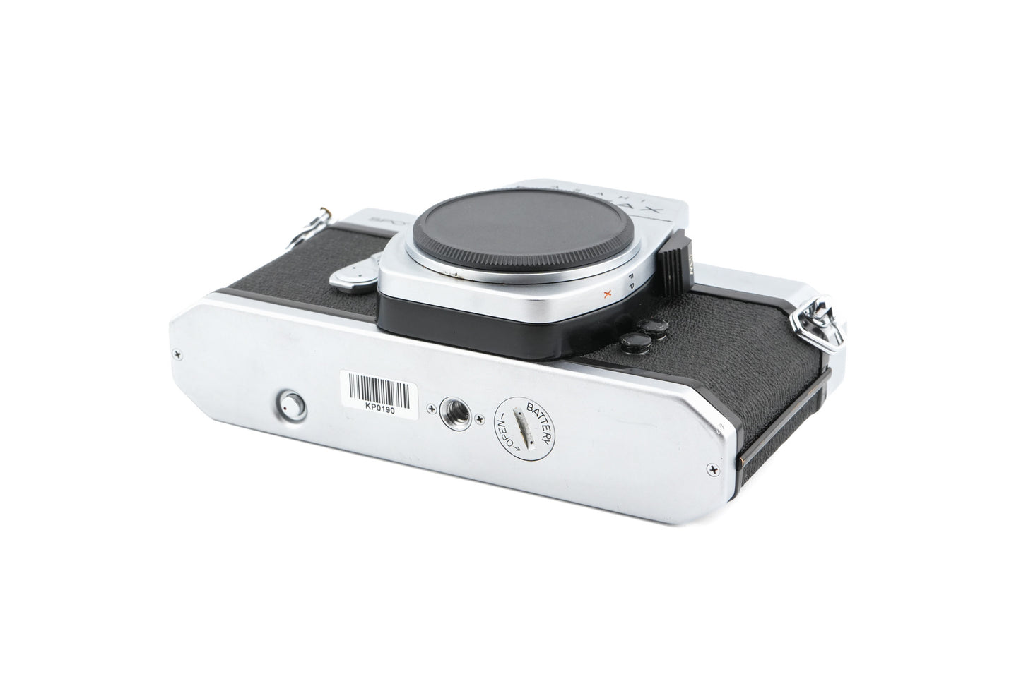 Manual focus M42 mount 35mm SLR camera released by Asahi Pentax in 1971. This camera was released alongside the SMC line of lenses and was the first Spotmatic to include a hot shoe for flash. It was made to use a 1.3V PX-400 mercury battery for the light meter. Metal body available in black & silver.