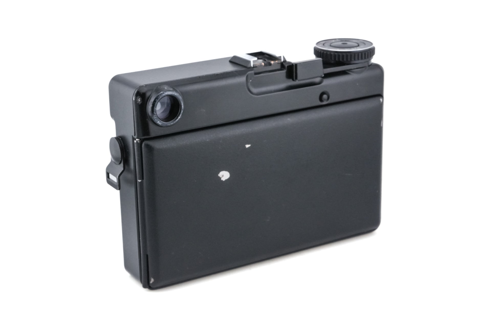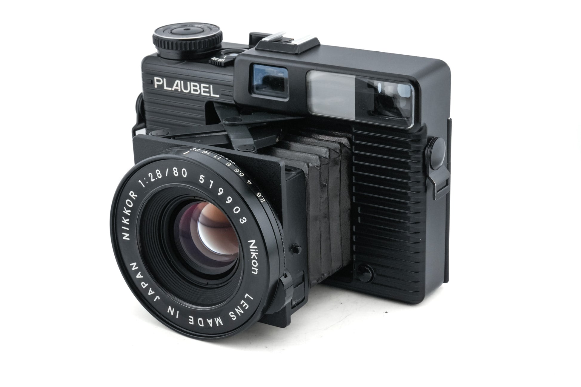Manual focus 120 folding rangefinder camera released by Plaubel in 1984. It was first produced by Copal and then by Mamiya. This second version of the Plaubel folding 6x7 rangefinder made some cosmetic changes and changed the advance mechanism from double to single stroke. It also now supports 220 film. Metal and plastic body in black.