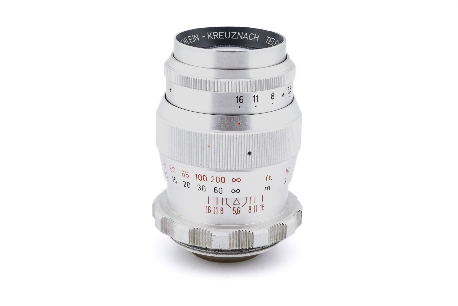 Manual focus telephoto lens made for Braun Paxette 35mm cameras by Roeschlein-Kreuznach. It uses an M39 thread mount identical to LTM lenses, but is made for the longer flange distance of the Braun Paxette. It will not focus properly on LTM cameras without an adapter. Metal body available in silver.