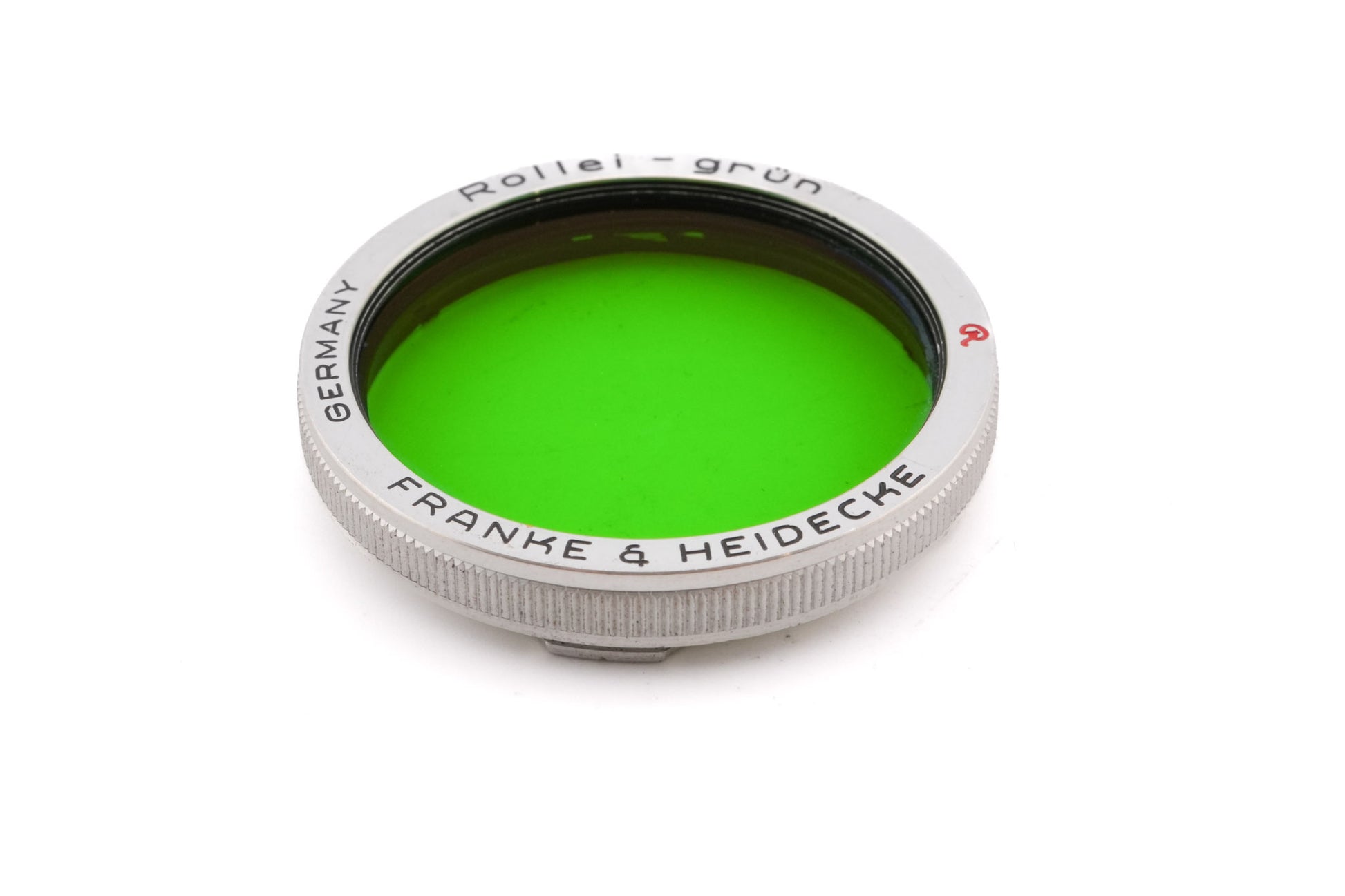 Green filter made by Rollei with bayonet I filter mount. Lighten dark greens making the image look more natural. Chrome metal body.