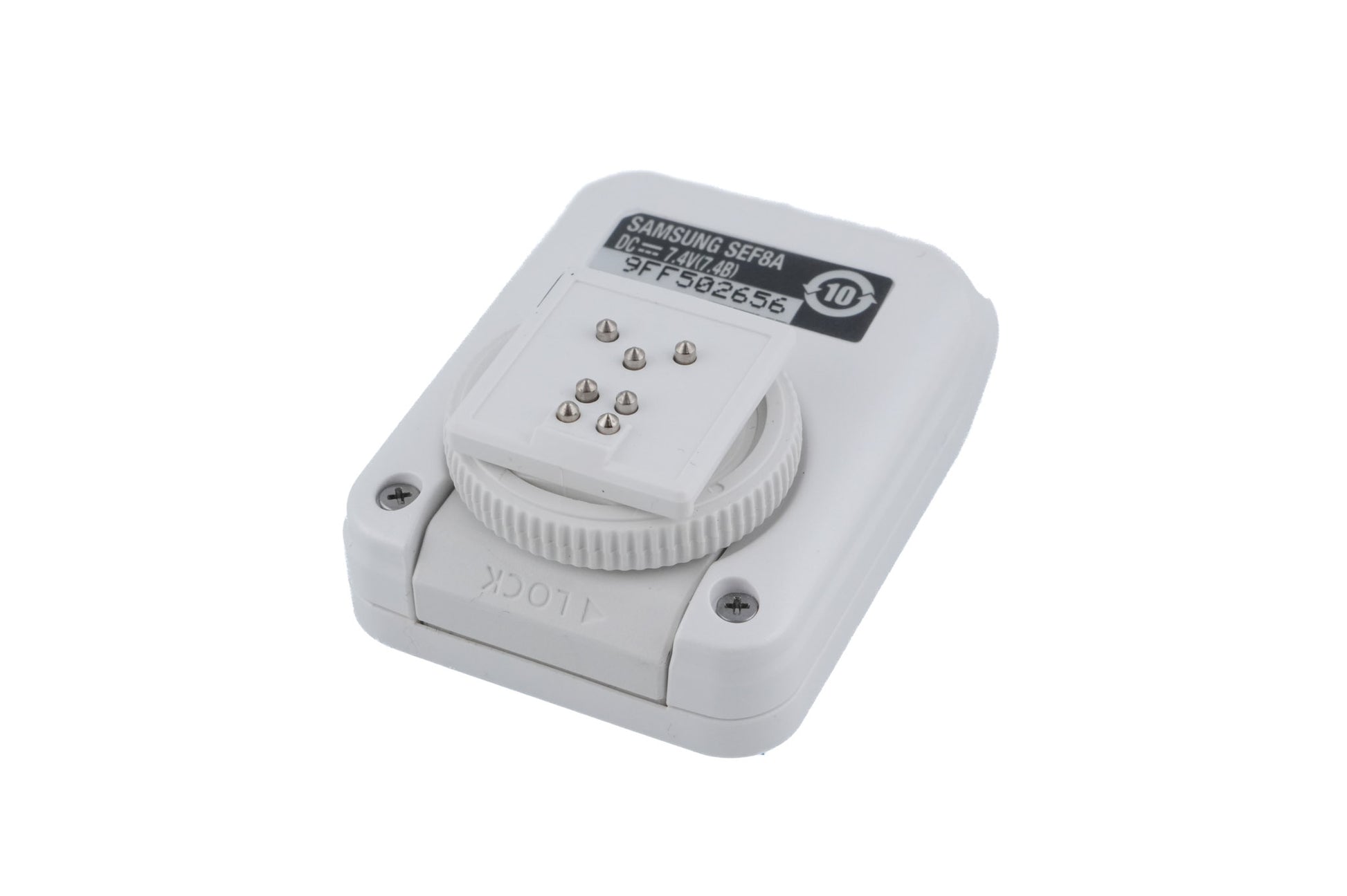 Hotshoe-mounted flash made by Samsung. Plastic body available in black, white, and silver.
