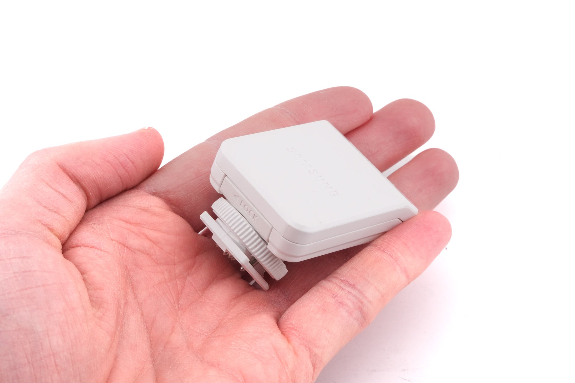 Hotshoe-mounted flash made by Samsung. Plastic body available in black, white, and silver.
