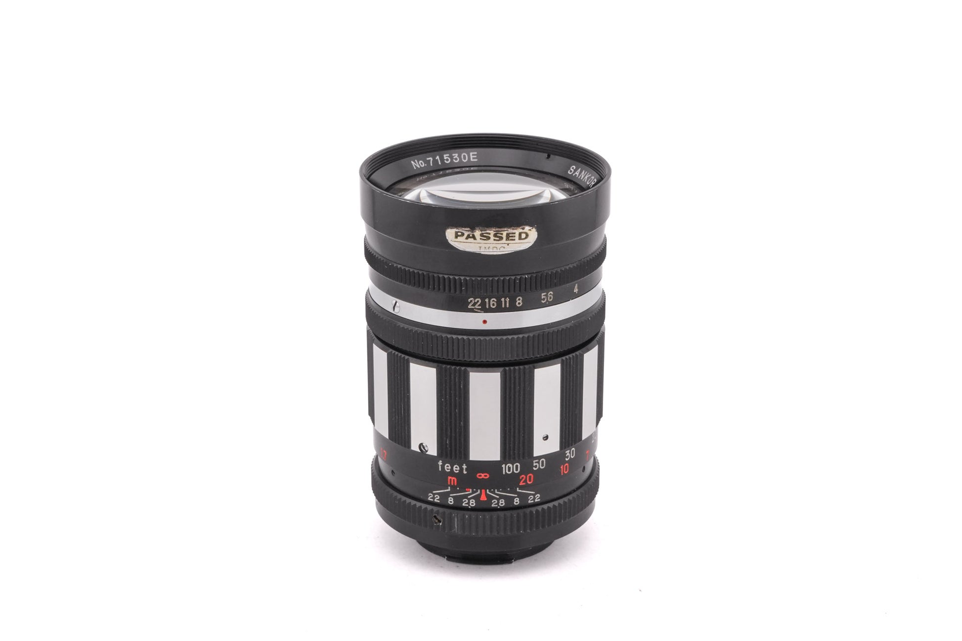 Manual focus telephoto lens made for T2 screw mount 35mm SLR cameras introduced by Sankor. It has a preset clickless aperture. Often comes with an M42 adapter. Metal body available in black with zebra stripes.