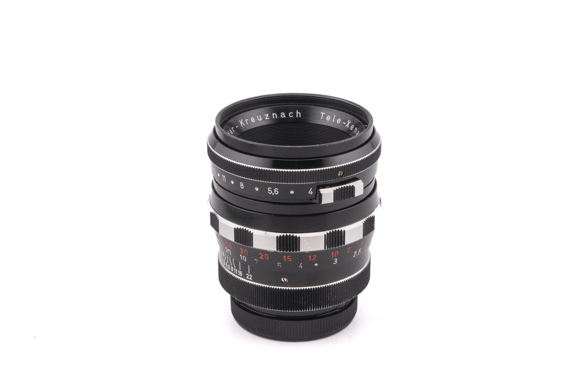 Manual focus telephoto lens made for Exakta mount 35mm SLR cameras introduced by Schneider-Kreuznach. It has a preset aperture. Metal body available in black.