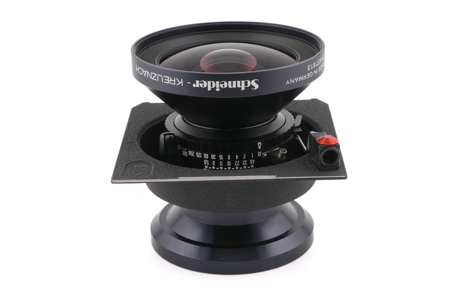 Manual focus wide angle lens made for large format cameras by Schneider-Kreuznach. It has a 24.3mm equivalent focal length on 4x5 and 18mm on 5x7. Metal body available in black.