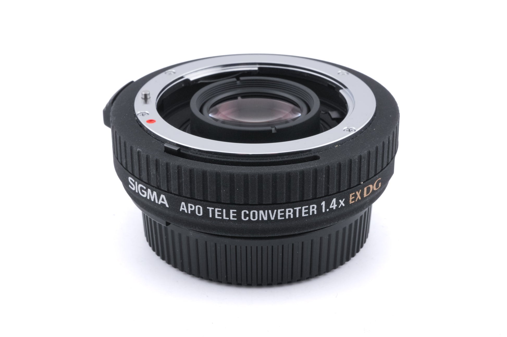 Teleconverter made for F-mount lenses and cameras introduced by Sigma. It multiplies the focal length of the lens by 1.4x at the cost of 1 EV of light transmission. It requires a body and lens that control the aperture and focus information electronically. Metal/plastic body available in black.