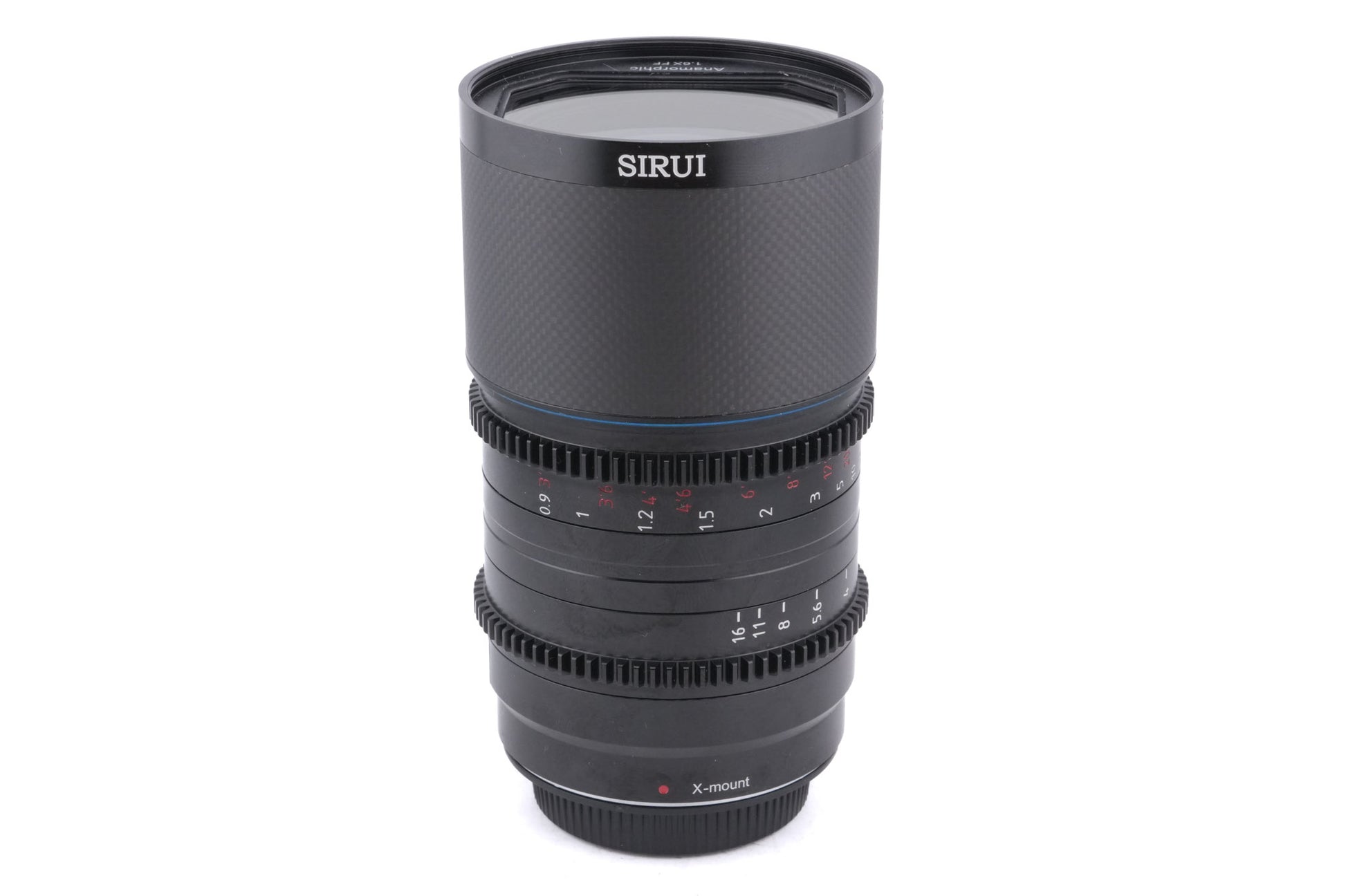 Manual focus anamorphic cinema lens made for Fujifilm X-mount digital mirrorless cameras by Sirui. It gives a 1.6x anamorphic stretch. This variant has a neutral flare, but Sirui also sold them with a special blue flare. Metal body available in black.