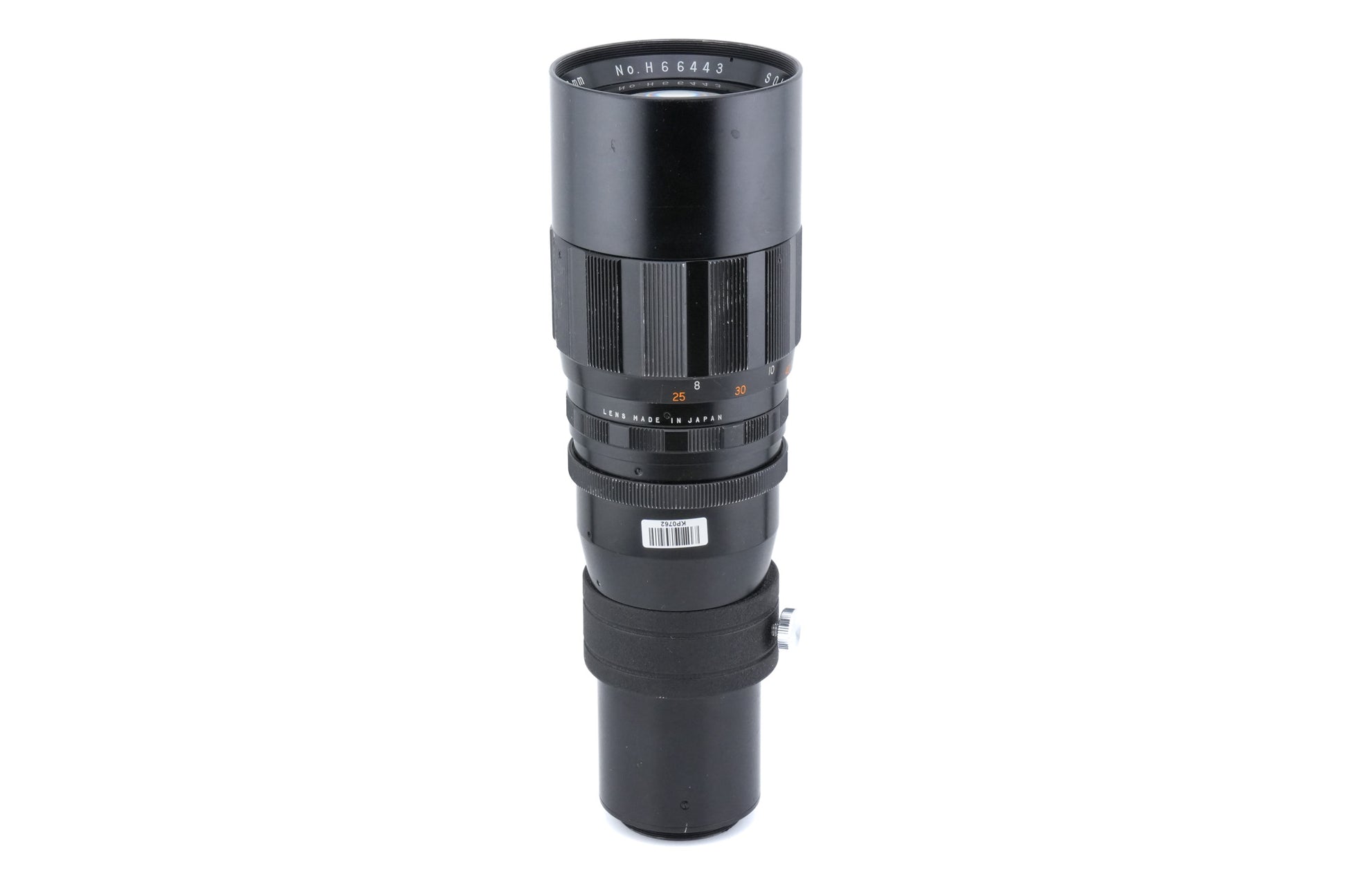 Manual focus telephoto lens with a T2 screw mount introduced by Soligor. The lens has an integrated tripod mount ring and a two ring preset aperture mechanism. Metal body available in black.