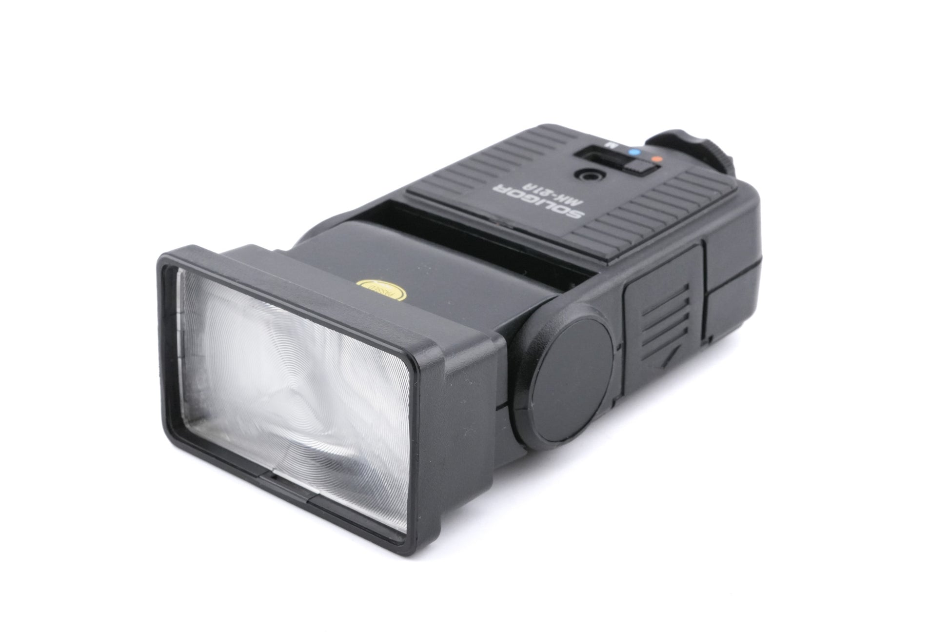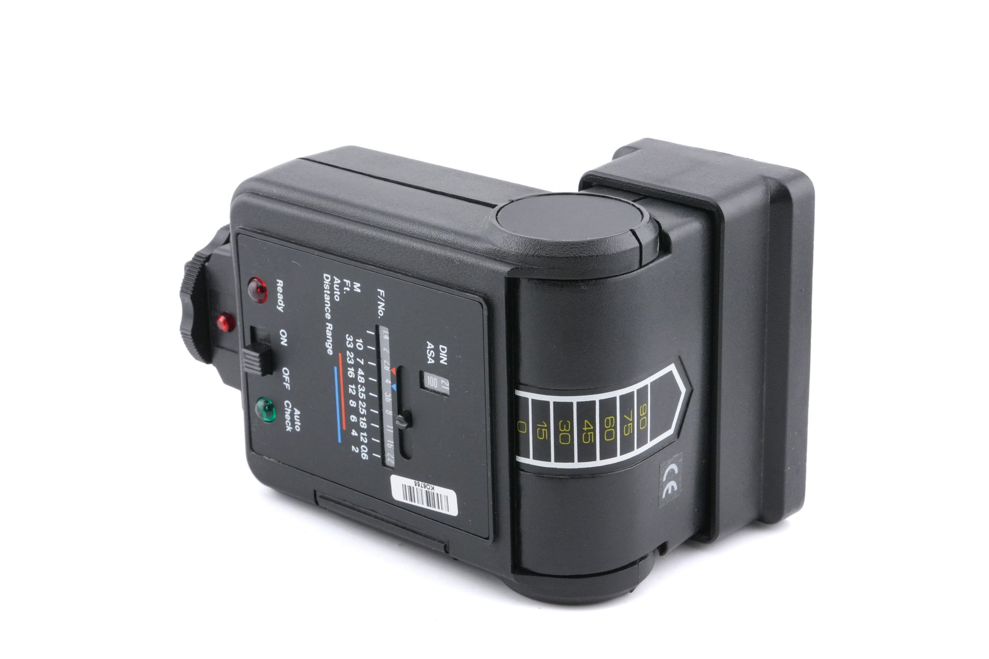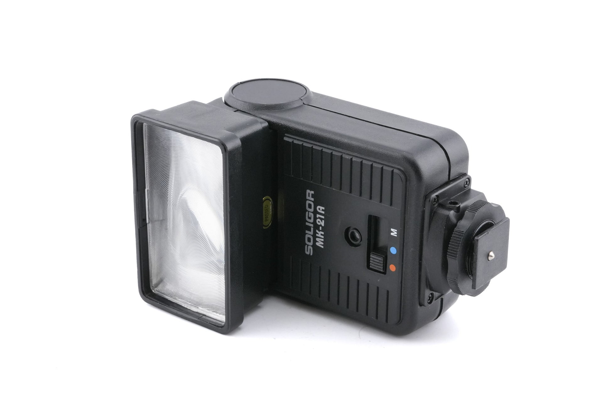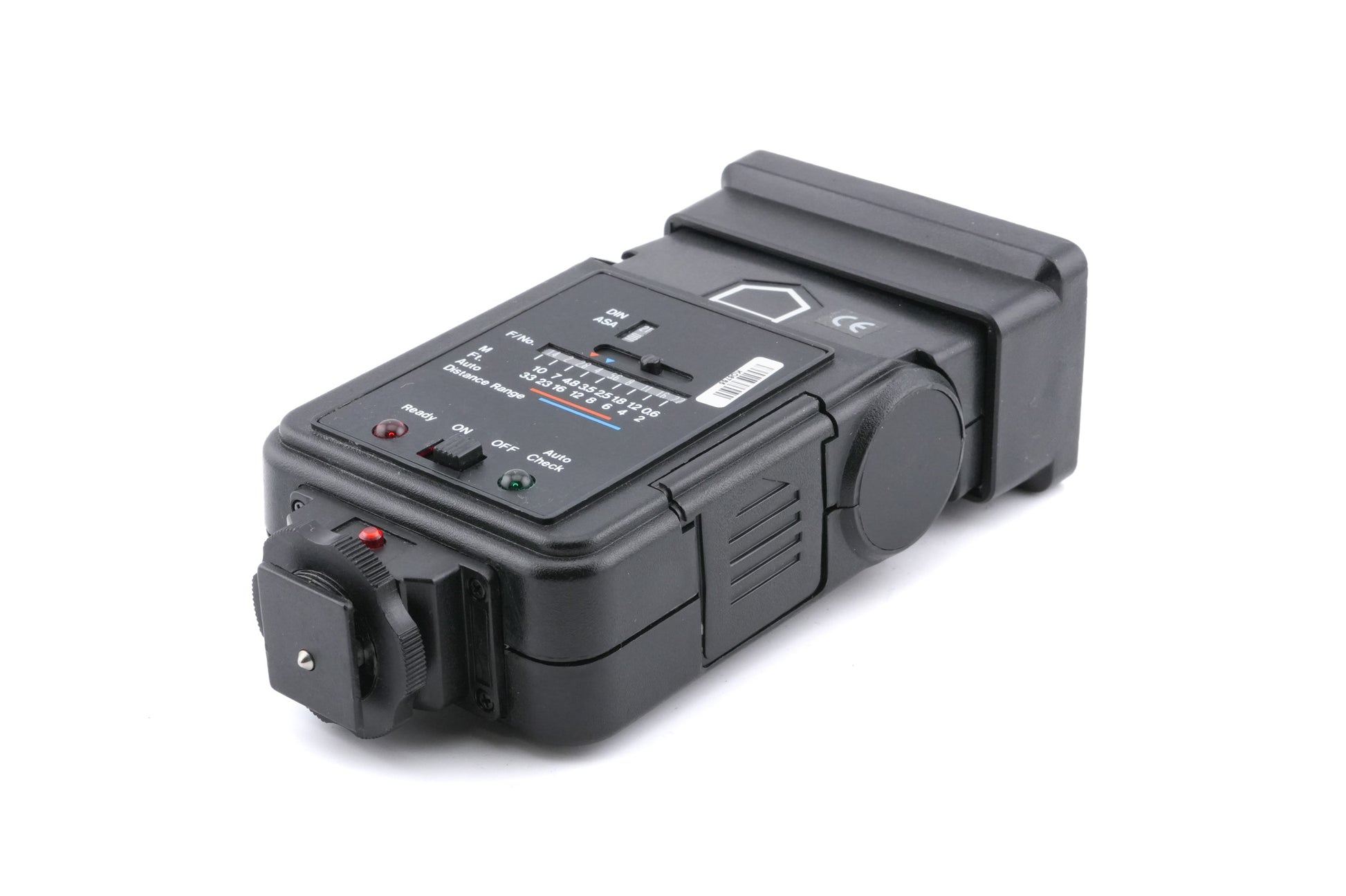 Flash made by Soligor for all cameras with a hot shoe or PC sync port. Has a single flash contact for manual flash control. Has 3 strengths, an attachable diffuser, and a 90º tilting head. Plastic body available in black.