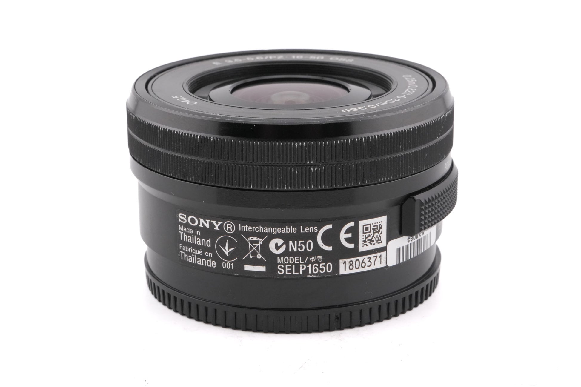 Autofocus zoom lens for E-mount digital mirrorless cameras made by Sony. It is made for APS-C-sized sensors and gives the equivalent field of view to a 24-75mm lens on full-frame/35mm. The product code is SELP1650. Plastic body available in black & silver.